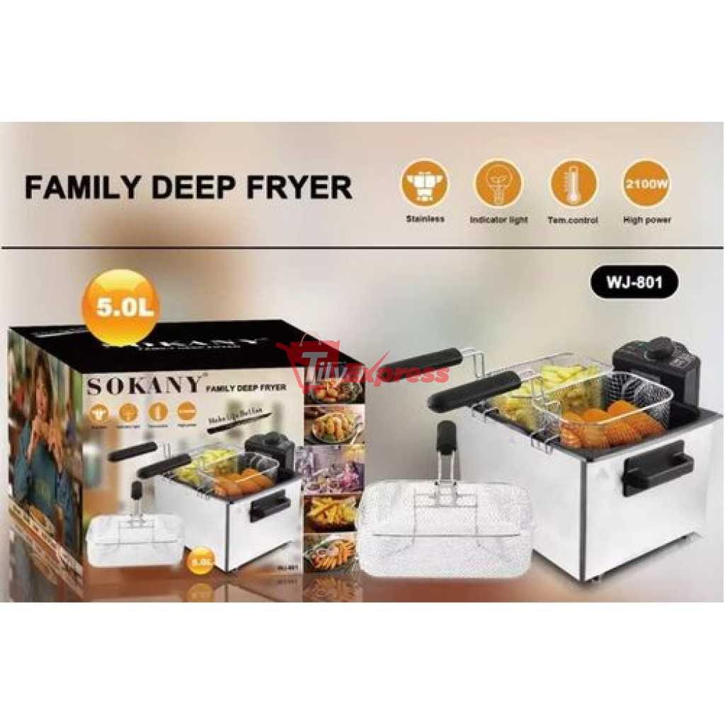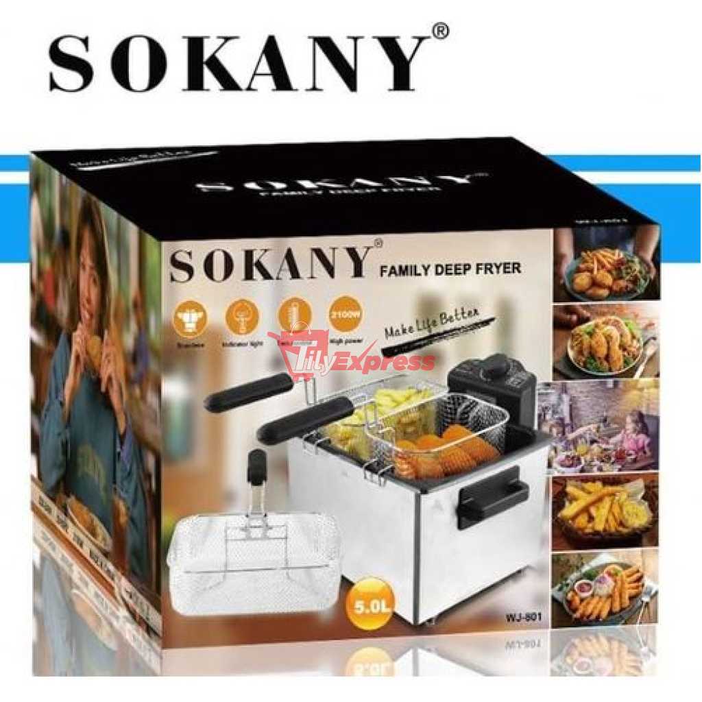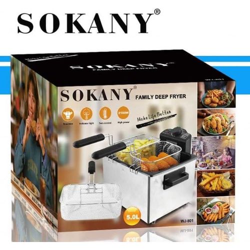 Key Features: Sokany 5L Electric Deep Fryer With 3 Frying Basket WJ 801 2100W 5 Liter Air Fryer Smokeless Oilless Detachable Pot Stainless Steel 2000W 4 Fashion design for stainless steel housing Detachable pot for easy cleaning Removable heating elements With the temperature controller function Skid-resistant feet Capacity: 5L