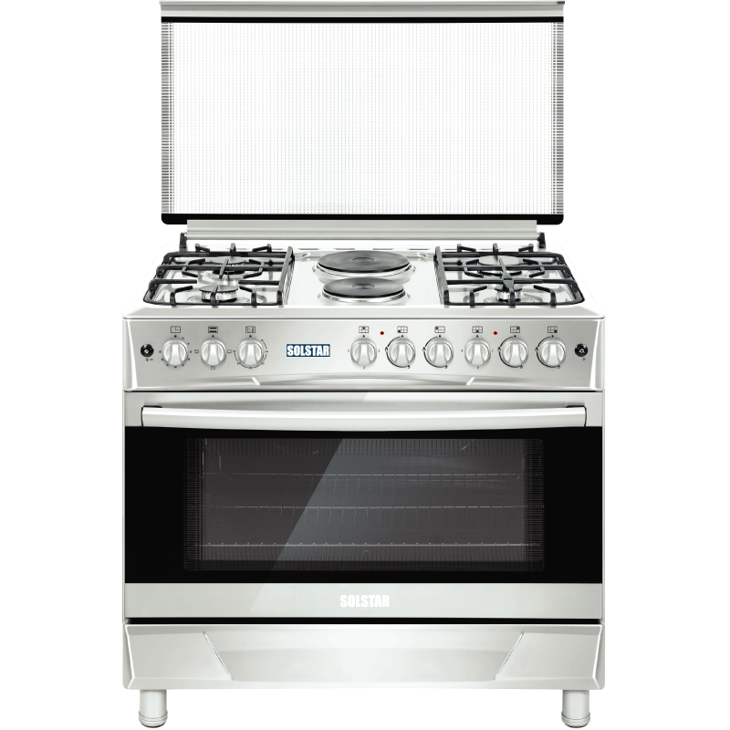 SOLSTAR 90x60cm SO942DEINBSS 4 Gas + 2 Electric Silver Cooker with Electric Oven, Rotisserie, Grill. 4 Gas Burners 2 Electric Burners WxD; 90x60cm Electric Oven, Electric Grill Rotisserie Enameled Pan Support, Push Button (automatic) Ignition for Hob Burners, Glass Top Lid, Double Glass Oven Door Top and Bottom oven heating elements Colour: Silver 2-year warranty