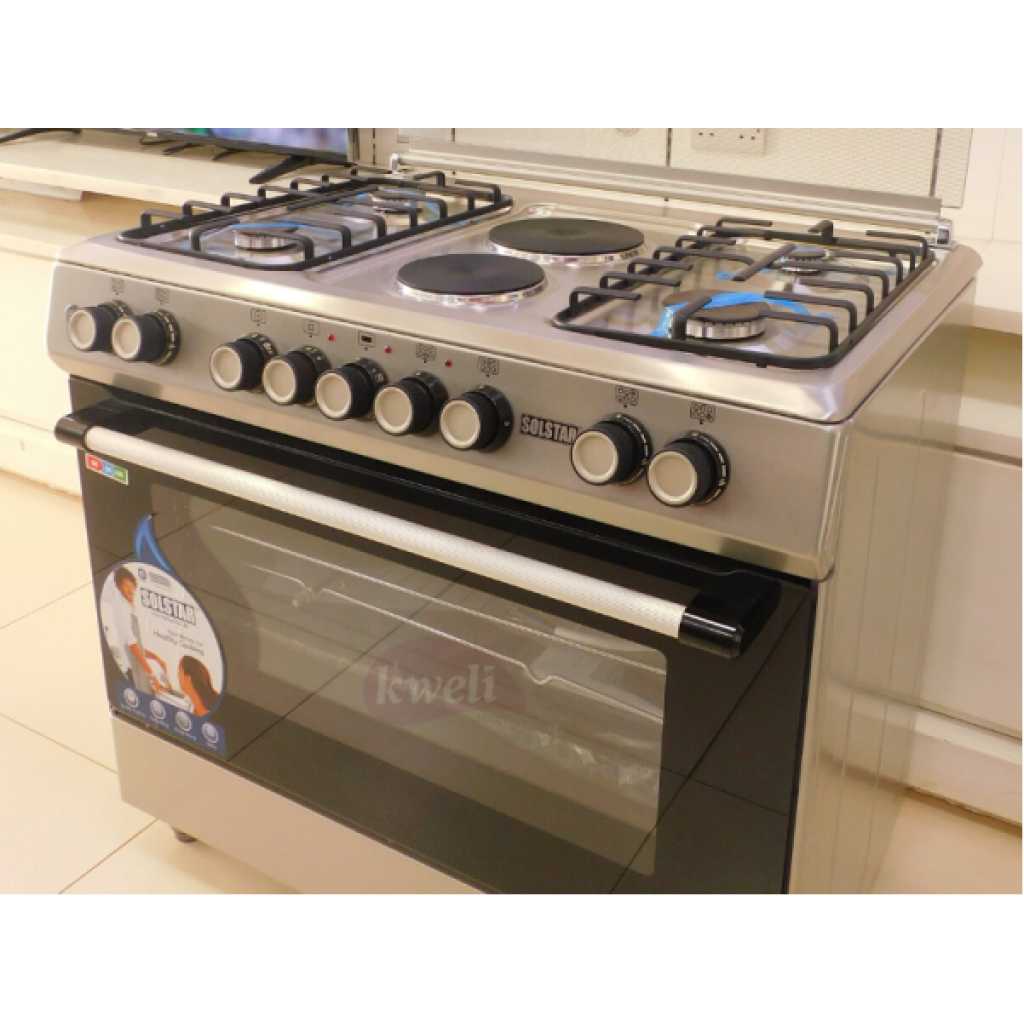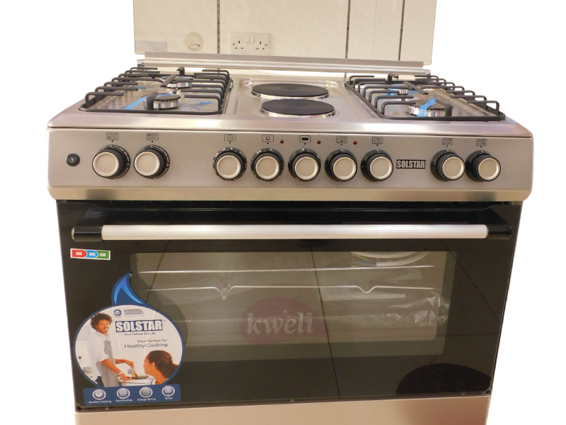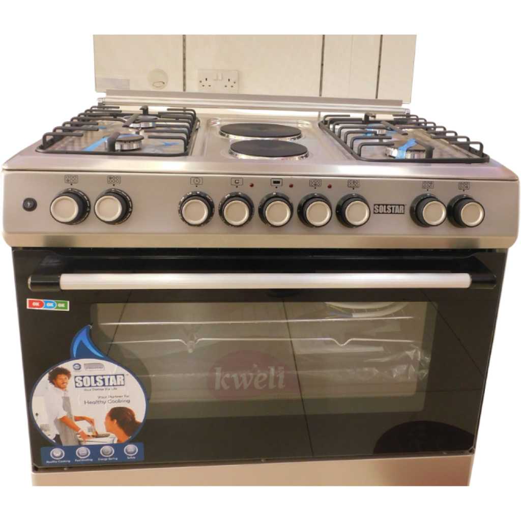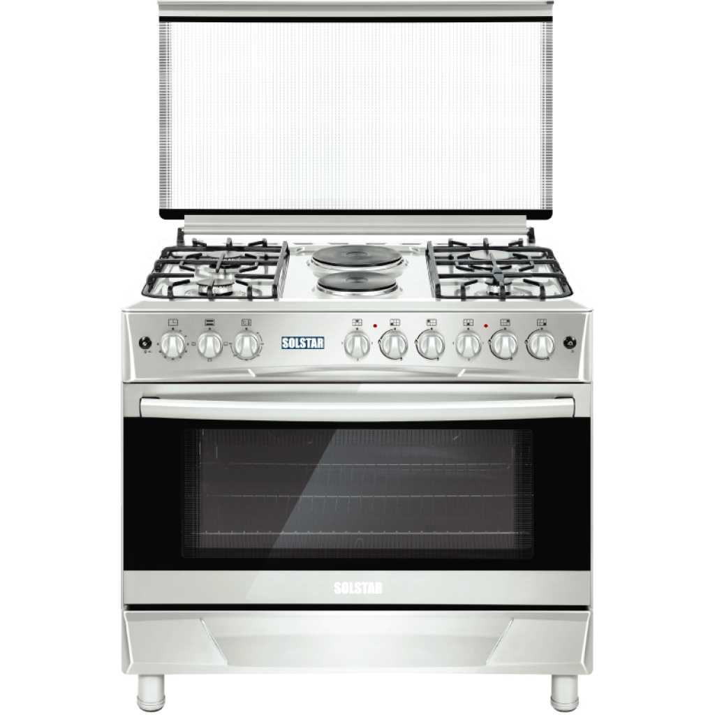 Key Features: SOLSTAR 90x60cm SO942DEINBSS 4 Gas + 2 Electric Silver Cooker with Electric Oven, Rotisserie, Grill. 4 Gas Burners 2 Electric Burners WxD; 90x60cm Electric Oven, Electric Grill Rotisserie Enameled Pan Support, Push Button (automatic) Ignition for Hob Burners, Glass Top Lid, Double Glass Oven Door Top and Bottom oven heating elements Colour: Silver 2-year warranty