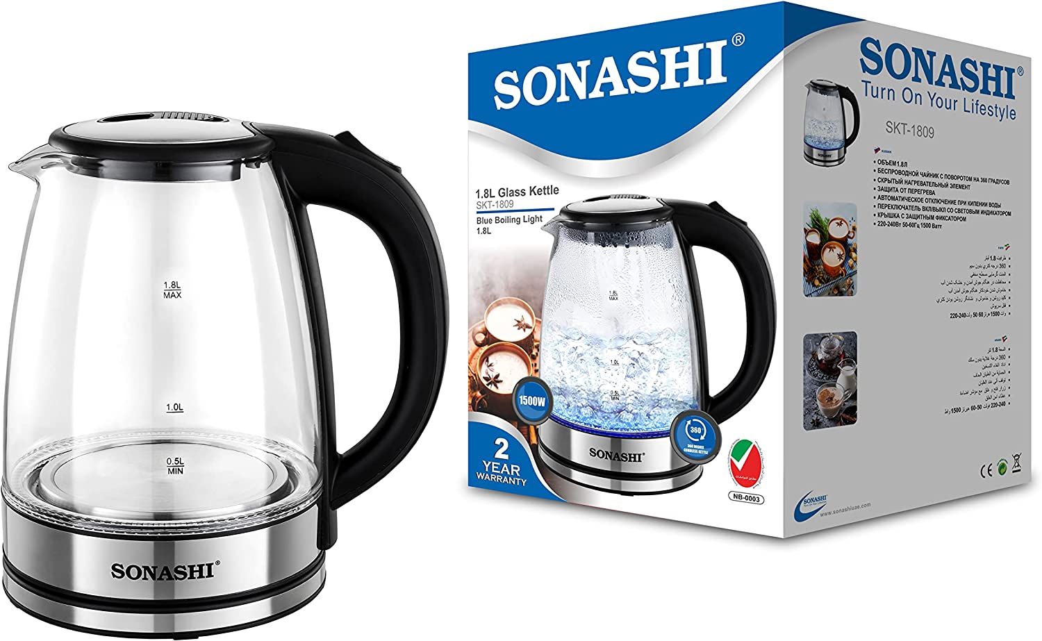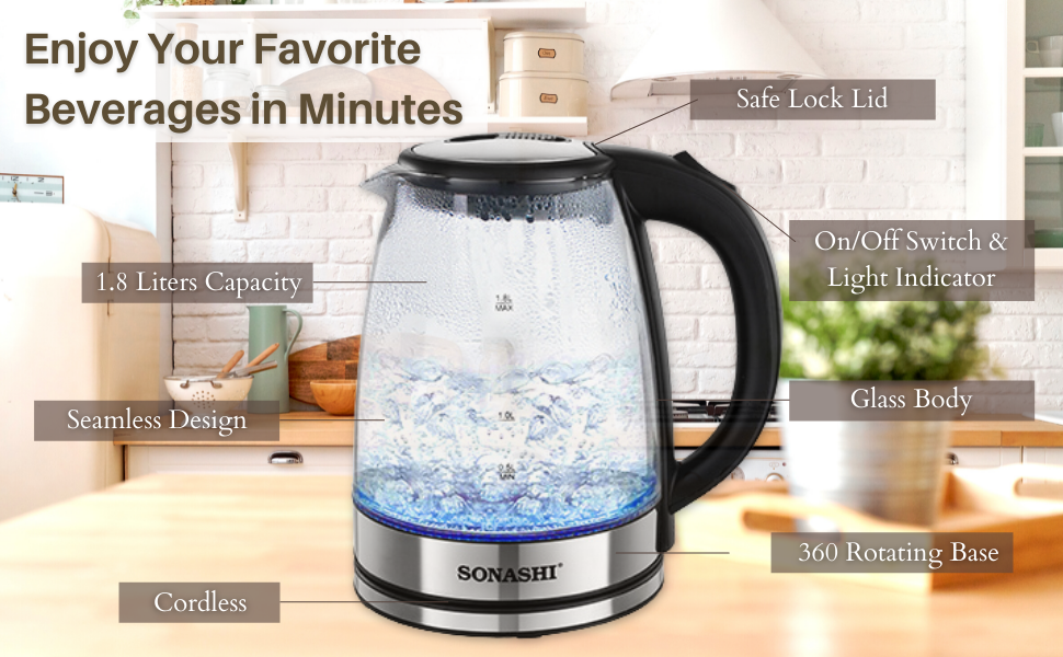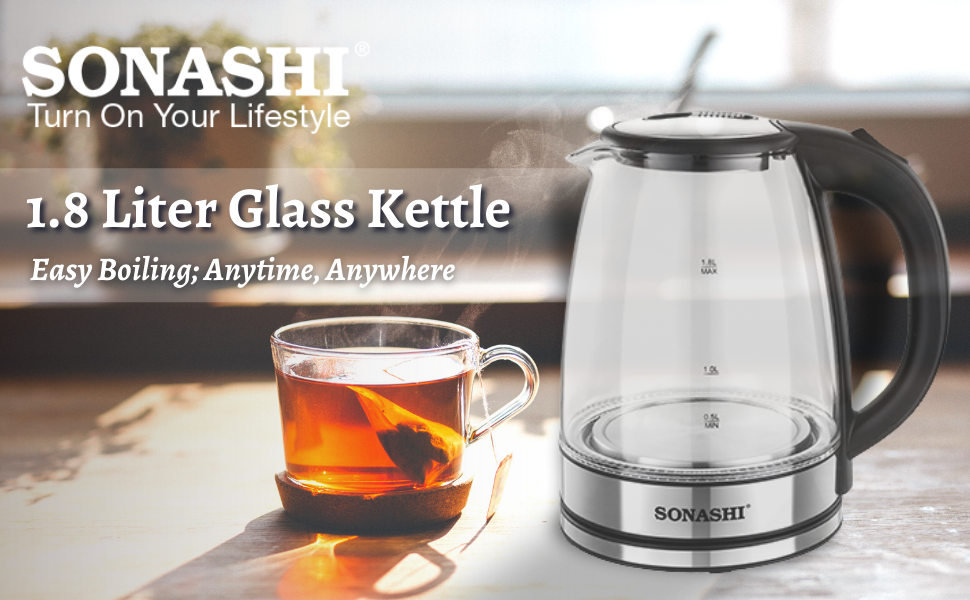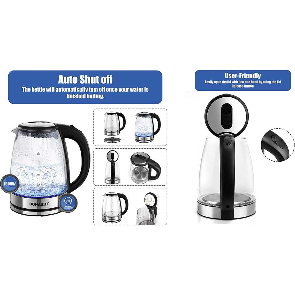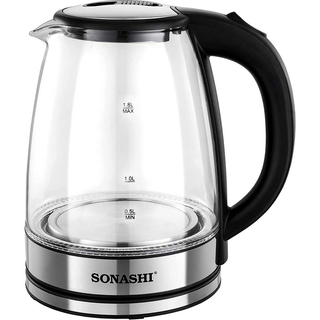 Sonashi 1.8 L Cordless Kettle SKT-1809 – Glass Kettle w/ Safety Lock Lid, 360-degree Swivel Base, Auto Shutdown, Power On/Off Indicator Light | Home Appliances.
