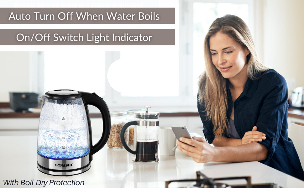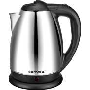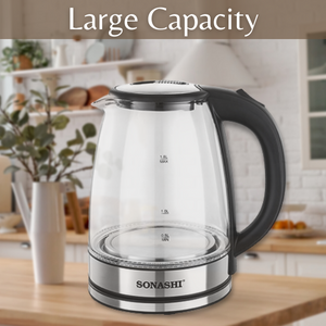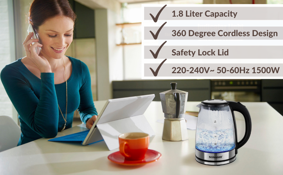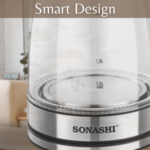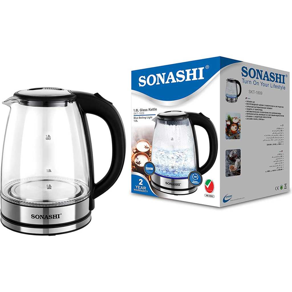 Key Features: Sonashi 1.8 L Cordless Kettle SKT-1809 – Glass Kettle w/ Safety Lock Lid, 360-degree Swivel Base, Auto Shutdown, Power On/Off Indicator Light | Home Appliances. Stylish Kitchen Essentials: Sonashi 1.8l Kettle combines modern features with timeless elegance. It is an efficient kitchen tool allowing you to boil water, and make tea or soups within minutes. Cordless Portable Kettle: This modern electric kettle has a cordless design which means you can detach the water kettle from its 360-degree swivel base and carry it for easy pouring. The single push start/stop button makes it easy to use. Solid Construction: This cordless electric kettle has a glass body. It has an inner core made with stainless steel to keep the content hot for long. It has a 1550W power motor with a concealed heating element that helps boil 1.8l of water within minutes. Safety Features: The advanced kitchen kettle is equipped with a boil-dry protection mechanism that shuts off the power supply when the water tank is empty or dries out during use. Its red power on/off indicator helps avoid overheating. Product Specification: Sonashi 1.8L glass water kettle comes with a safety locking lid for security and works on a low power requirement of 220-240V and 50/60Hz.