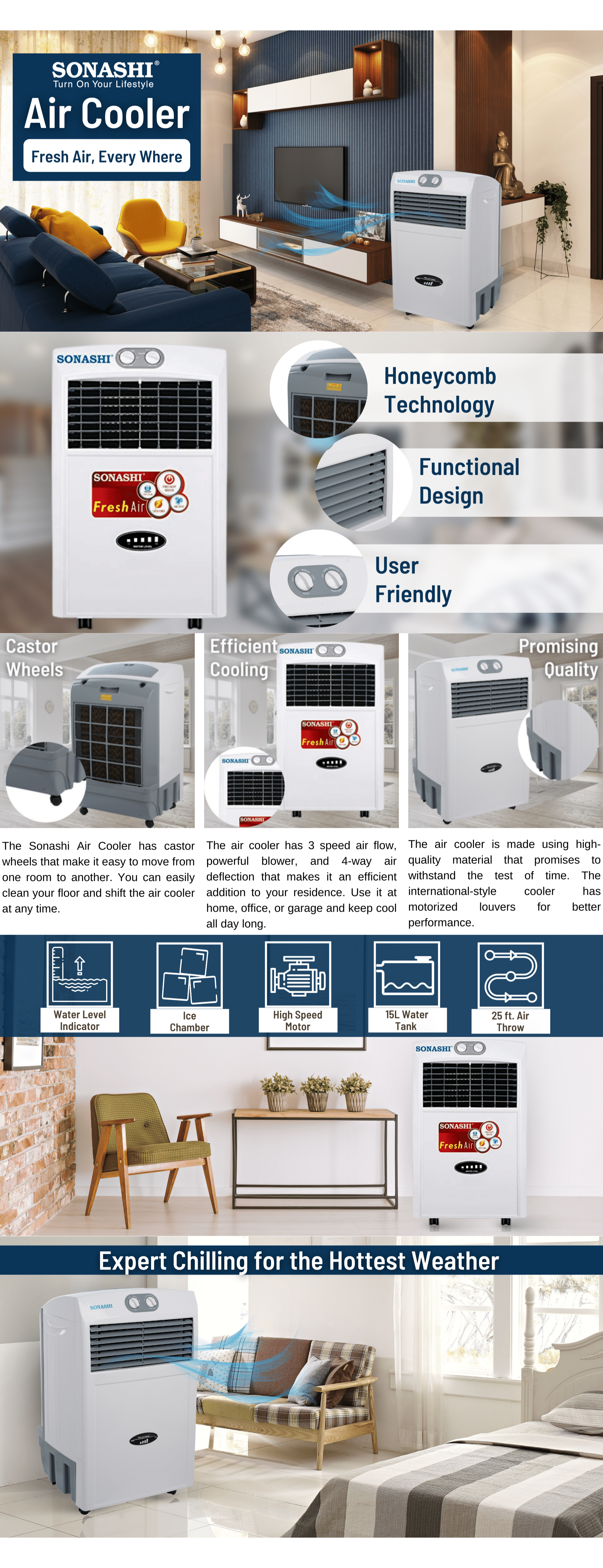 Key Features: HONEYCOMB TECHNOLOGY MOTORIZE LOUVERS HIGH SPEED MOTOR CASTOR WHELL FOR EASY MOVING LARGE WATER TANK CAPACITY 15L 3 SPEED AIR FLOW POWERFUL BLOWER 4 WAY AIR DEFLECTION INTERNATIONAL STYLE AIR THROW 25 FEET DISTANCE WATER LEVEL INDICATOR ICE CHAMBER AIR DELIVERY 1250 M/HR.3 AC 220-240V 50/60HZ 160W