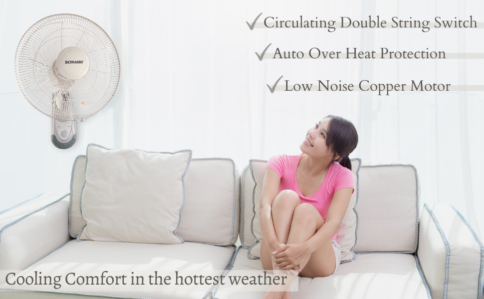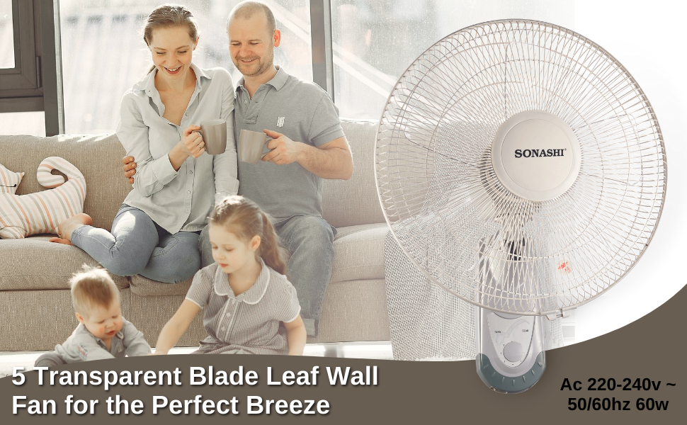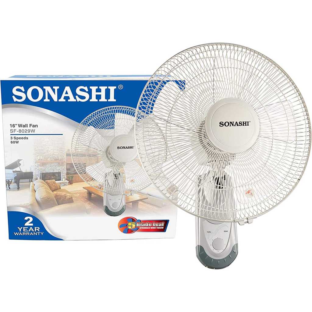 Key Features: SONASHI SF-8029W Wall Fan – [White] 16 in. Wall Hanging Fan with Circulating Double String Switch, 3 Speed Switch, 5 Transparent Blade Leaf | Perfect Home Décor Appliance. Wall Mount Fan: Sonashi introduces this impeccable mountable fan that accentuates the aesthetic appeal and creates a soothing and cool ambiance. You can install this fan above your study desk, workstation, dining area, or living room. Elegant Design: Embracing a solid white colour, this industrial-grade wall fan features a portable and streamlined design. It comes with 5 transparent blade leaves and circulating double string switches to adjust the movement and speed for the desired airflow. Excellent Craftsmanship: This 5-blade wall table features a 3-speed switch and oscillation function to adjust the speed of the airflow. It also features a Korean guard ring that holds the fan mesh in place and adds to its lasting performance. Great Performance: The portable wall mount fan features a self-protection system that protects its functionality when overheated. It runs efficiently on a 60W in-built copper motor that ensures a low-noise operation. Product Specification: Sonashi household wall fan is 16 in. high and comes in a solid white colour. It saves energy and produces low noise by operating efficiently on a 220-220 volts power supply.