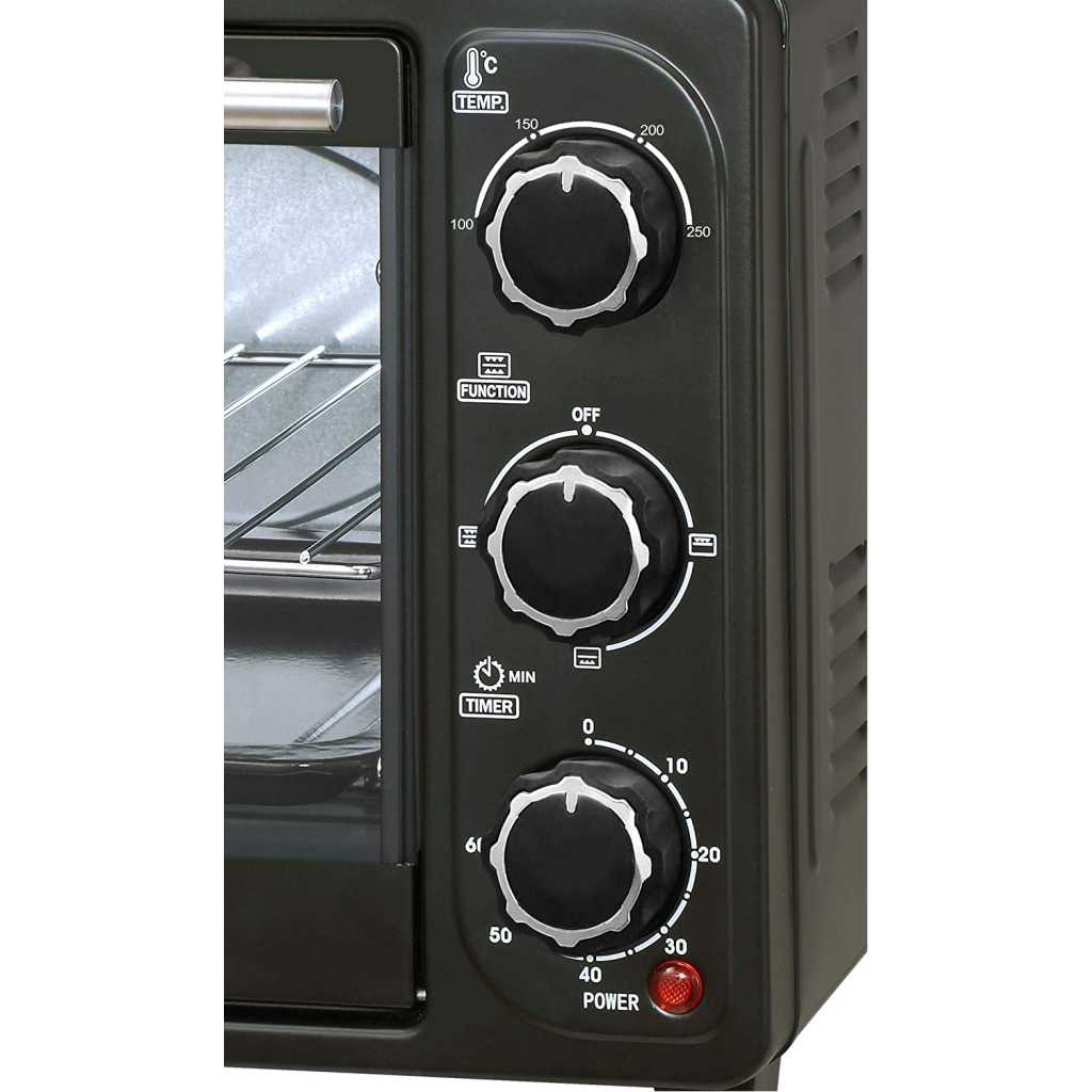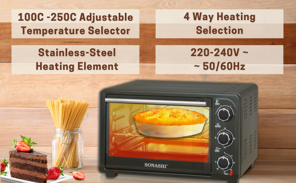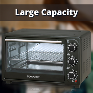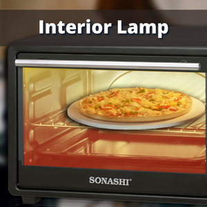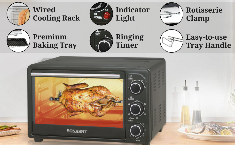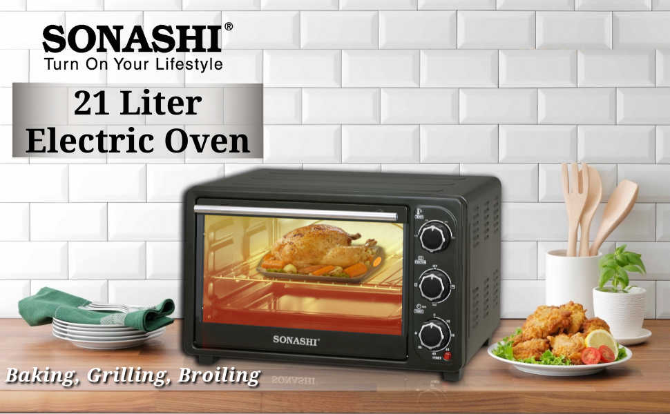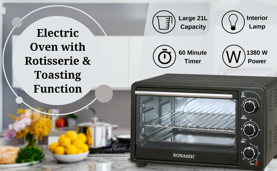 Key Features: SONASHI STO-730 Electric Oven – 21L, Countertop Electric Oven with Stainless Steel Heating Element, Inside Lamp, Indicator Light, Wire Rack, Tray Handle | Kitchen Electronic Appliances. Home Kitchen Appliance: Add this multipurpose electric over by Sonashi to your kitchen to get freshly baked and grilled food. It makes the ideal home kitchen accessory as it embraces a sleek design that compliments your interior settings. Sturdy Construction: The kitchen electric oven embraces a stainless-steel heating element that ensures durability and maximum protection against corrosion and abrasion. The transparent glass door allows you to peek through to watch how your food is grilling or baking. The quality craftsmanship adds to its lifespan and excellent performance. Smart Design: This sleek stainless-steel electric oven comes with interior lighting that shows you how perfectly your food is cooking. It features a bell ring that indicates the completion of a cooking cycle. The timer can be set for about 60 minutes at a single time and it also embraces a 100 to 250-degree Celsius adjustable temperature selector. Large Capacity: This Sonashi electric embraces a 21-litres large capacity that lets you grill a whole chicken in one go. It provides enough space to accommodate a medium-size pizza, multiple bread rolls, pastries, making it an ideal kitchen appliance for big families. Attachments/Accessories: The 21L electric oven comes with different attachments, including a wire rack, tray handle, tong and baking tray to let you bake or grill your favourite food items. It efficiently produces 1380 watts of power input and offers a low-noise operation.