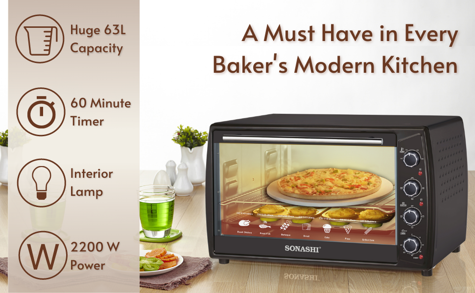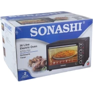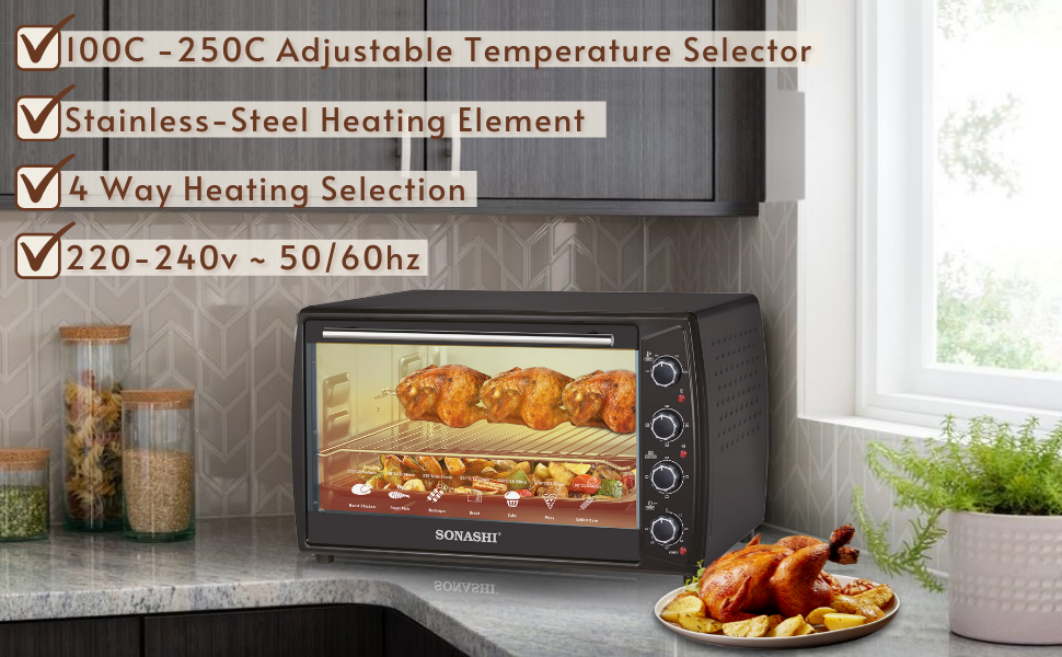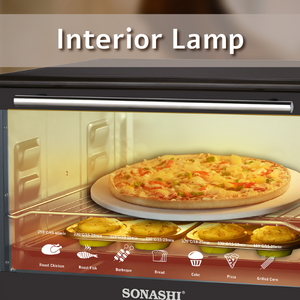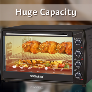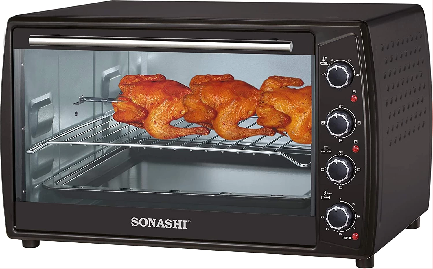 Key Features: Sonashi STO-732 63 Liters Electric Oven w/Indicator Light, Inside Lamp, Cooking Accessories, Adjustable Temperature, Timer | Electric Oven | Home Appliances. Accommodating Design: This electric oven features a black colored exterior with rotisserie and convection functions. You can cook variant recipes in this oven. Robust Oven: This oven has a stainless-steel heating element to deliver uniform heat to the food. You can easily grill 3 chickens at a time. The premium-quality inside lamp will help you see how well the food has cooked. Multi-Purpose Oven: This electric oven offers a rotisserie and convection function with four heating selections, adjustable temperature controller, and more to help you cook multiple variant recipes without any trouble. Compelling Performance: This fully accessorized electric oven includes a baking tray, wire rack, tray handle, and tong to help you access and place your food from and in the oven easily. The indicator light and timer with a bell ring will inform you when your food is ready. Product Specifications: This 63-liter electric oven has a stainless-steel heating element for uniform heat distribution. You can easily adjust the timer between 100°C to 250°C with the controller. The timer will ring when the food gets ready. This stainless-steel oven consumes 2200W to operate.