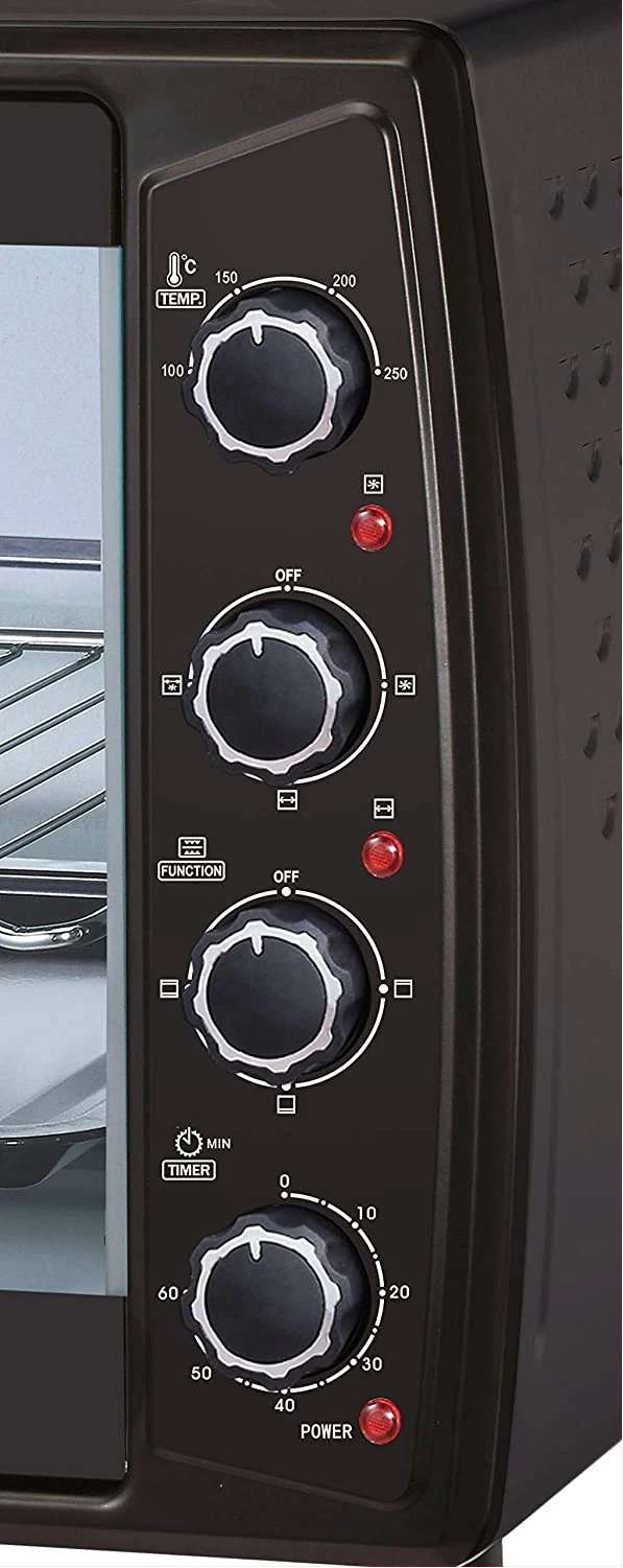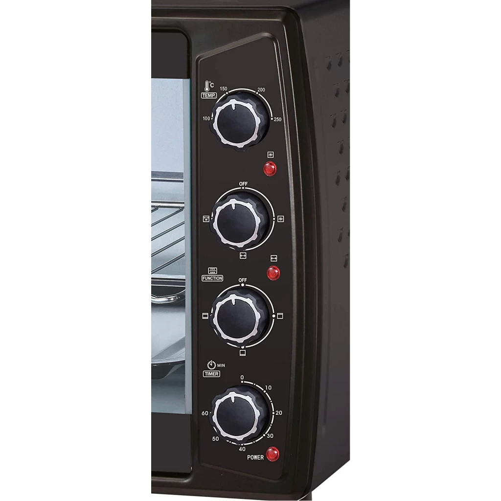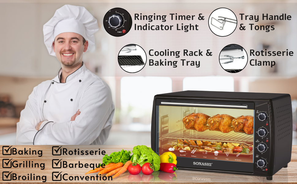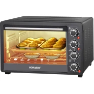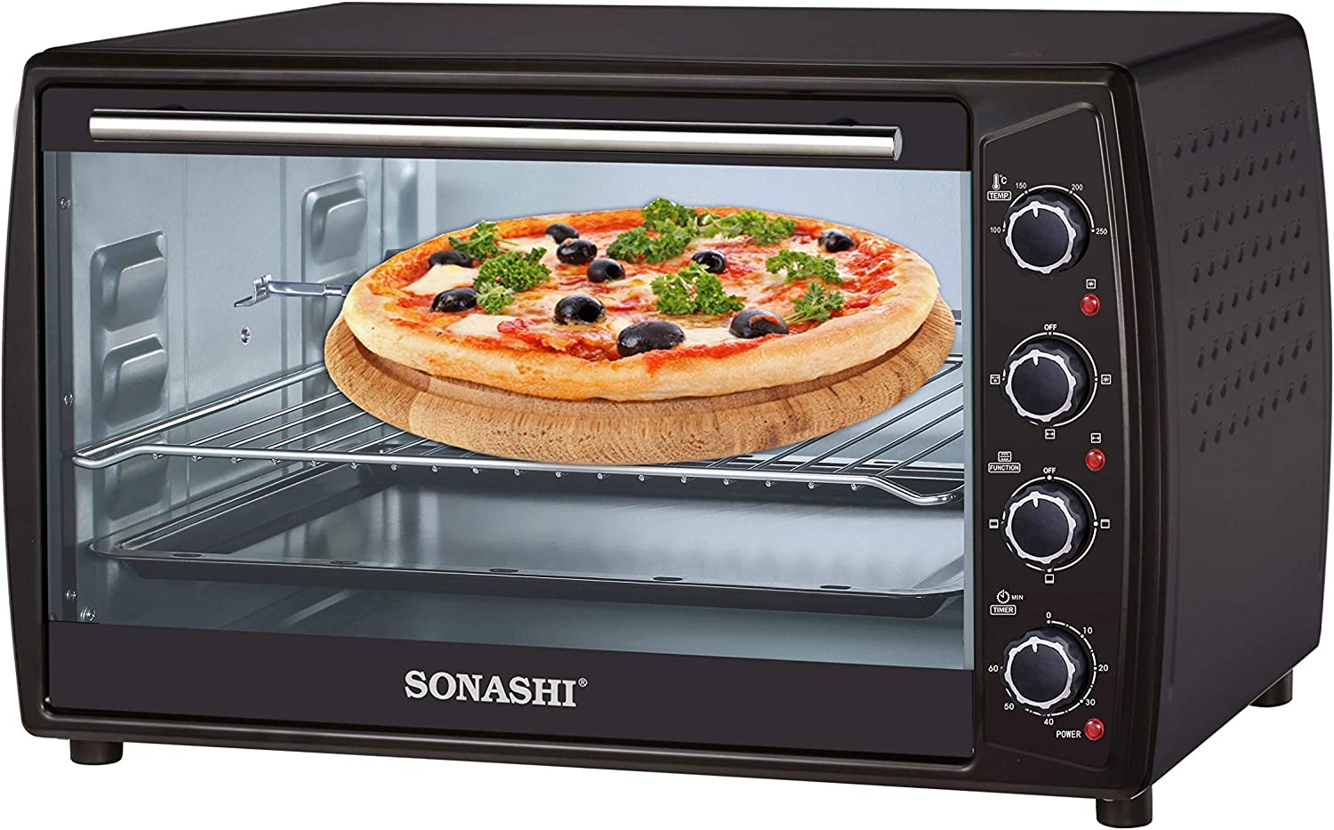 Key Features: Sonashi STO-732 63 Liters Electric Oven w/Indicator Light, Inside Lamp, Cooking Accessories, Adjustable Temperature, Timer | Electric Oven | Home Appliances. Accommodating Design: This electric oven features a black colored exterior with rotisserie and convection functions. You can cook variant recipes in this oven. Robust Oven: This oven has a stainless-steel heating element to deliver uniform heat to the food. You can easily grill 3 chickens at a time. The premium-quality inside lamp will help you see how well the food has cooked. Multi-Purpose Oven: This electric oven offers a rotisserie and convection function with four heating selections, adjustable temperature controller, and more to help you cook multiple variant recipes without any trouble. Compelling Performance: This fully accessorized electric oven includes a baking tray, wire rack, tray handle, and tong to help you access and place your food from and in the oven easily. The indicator light and timer with a bell ring will inform you when your food is ready. Product Specifications: This 63-liter electric oven has a stainless-steel heating element for uniform heat distribution. You can easily adjust the timer between 100°C to 250°C with the controller. The timer will ring when the food gets ready. This stainless-steel oven consumes 2200W to operate.