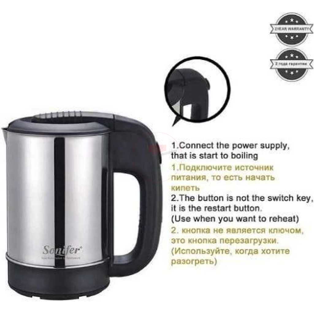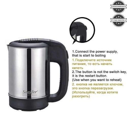 Key Features: Sonifer 0.5 Litres Stainless Steel Mini Portable Electric Kettle For Travel Hotel Office And Home- Silver Power Source: Electric Capacity: 0.5 Liter Used to boil water and make hot drinks Model no: SF-2011 stainless steel concealed heating element 360-degree connector on the power base power indicator light display the on/off button not automatic AC220-240V 50/60HZ 1000W