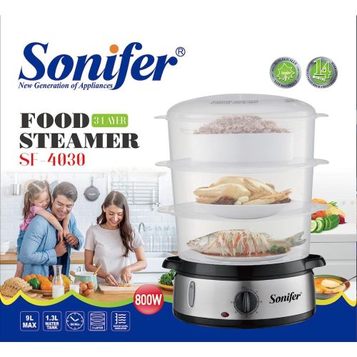Sonifer Electric Food Steamer for Cooking, 3 Tiers Vegetable Steamer, 800W Fast Simultaneous Cooking, 60-Minute Timer, Veggies Steamer, Ideal for Fish Seafood Rice, BPA-Free Baskets- Multicolor 13.7 QT Food Steamer for Fast Cooking: With 3-tier trays and 13.7 quarts of large capacity, the food steamer is spacious, versatile, and fantastic for batch cooking. Since the steamer has an 800W turbo-steam function, cooking is usually quick. Ideal for Cooking a Variety of Food: The large capacity multi-tier steaming system was designed to cook your entire meal in one pass. food steamer is ideal for steaming rice, vegetables, meat, fish, and eggs at once cooking. Save time while offering enough for special occasions and everyday use. Unique steam hole design can vapor permeate better and heat evenly. Easy to Operate Timer & Safe Anti-dry Protection: The 60-minute timer dial is simple to use and makes a beeping sound when the cooking time has ended. The steamer automatically shuts off for safety if the water happens to run out. The side water inlet and easily viewable water level indicator make refilling water more convenient while steaming is in progress. Thermostable healthy material, BPA-Free. Easy to Clean and Storage: The lid, three steamer trays, and drip tray are installable and detachable, easy to clean, and dishwasher safe. 3-tier steamer baskets with an ingenious stackable design allow for ultra-compact storage. It’s easy to store on countertops, cabinets, or pantry, best for your kitchen. Low-fat steam cooking maintains maximum vitamin and nutritional value. Customer Service: provides 24-hour friendly customer service. If you have any issues related to the veggies steamer, please feel free to contact us. Low-fat steam cooking maintains maximum nutritional value, flavor, texture, and color. electric food steamer is just the best tool for low-fat cooking.