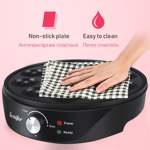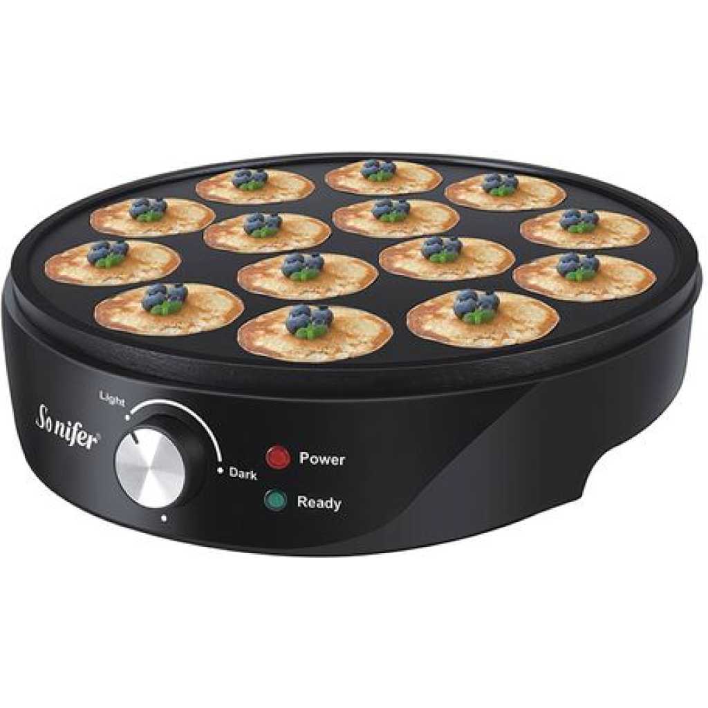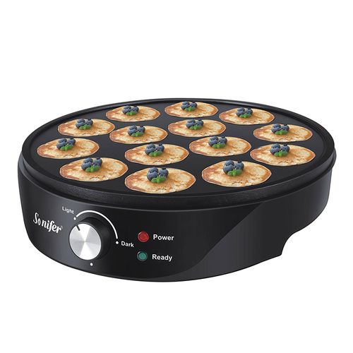 The sonifer pancake maker bakes 14 delicious mini pancakes at once. It is fun for every festive occasion. The high quality baking plate with non-stick coating is perfect for baking the mini pancakes in only just a few minutes. The pancake maker has a few holes where you can pour the pancake mix in, just the right size. The pancake maker has a ready-to-use light and power light. The non-slip feet keep it steady and safe. Easy to use and also easy to clean.