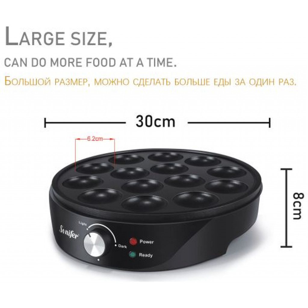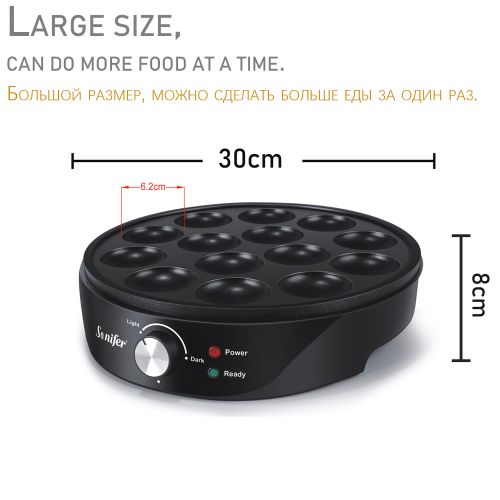 Key Features: Can also work as a Takoyaki maker or make a “dessert ball” There are 14 holes where each reset is 6.2cm in diameter There is an overheating protection thermostat (overheating protection). Non-stick, easy-to-clean disc Material: food grade stainless steel Weight: 1.8 kg The heat temperature can be adjusted (light = minimum, dark = maximum) Size: 30 x 30 x 8 cm