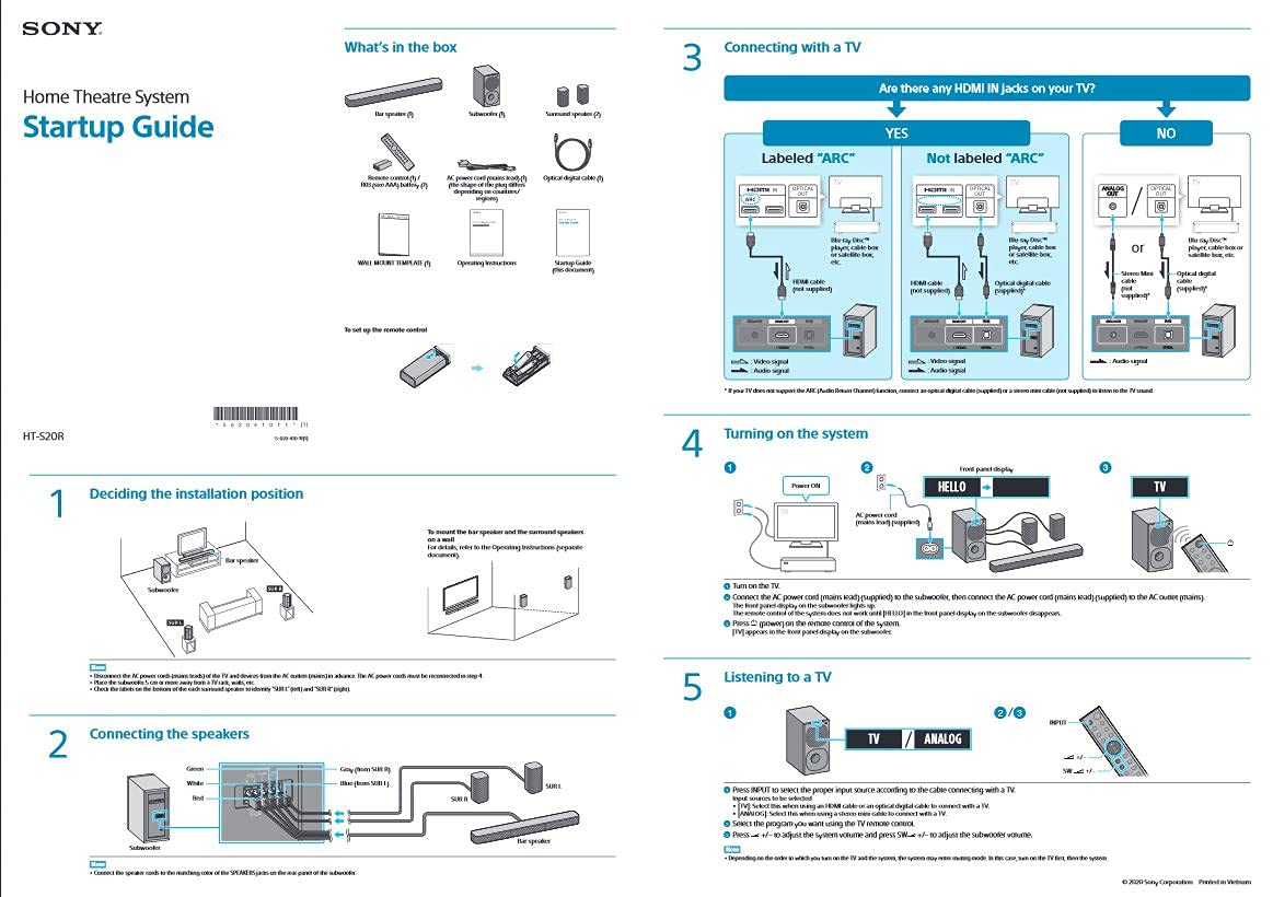 Key Features: Sony HT-S20R Real 5.1ch Dolby Digital Soundbar for TV with subwoofer and Compact Rear Speakers, 5.1ch Home Theatre System (400W,Bluetooth & USB Connectivity, HDMI & Optical connectivity) Dolby Audio : Enjoy dramatic, high-quality surround sound from 5.1 separate audio channels with Dolby Digital 5.1ch Surround Sound : 5.1 channels of real surround sound. Rear speakers and an external subwoofer work with a 3-ch soundbar to deliver dynamic, immersive, cinematic sound. Power Output : 400W power output puts you right at the heart of action. HDMI CEC : Yes Bluetooth Connectivity : Easily play your favourite content via bluetooth connectivity USB Playback :Use the USB port to plug and play music from a memory stick with ease Sound Mode :A button for every sound—choose the mode that’s right for whatever you’re watching or listening to, including Auto, Standard, Cinema and Music. You can also select Night and Voice modes HDMI Arc and Optical Connectivity : Connect your soundbar with TV via single cable connection
