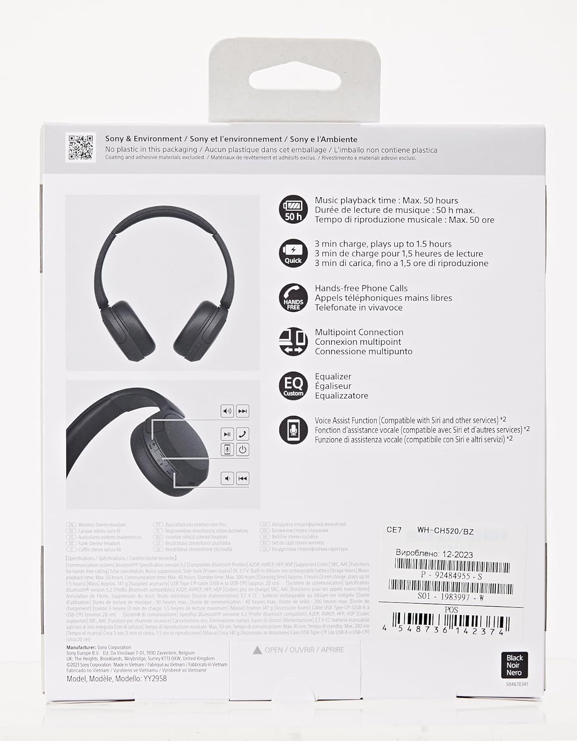 Sony Wireless Bluetooth Headphones - Up to 50 Hours Battery Life with Quick Charge Function, On-Ear Model - WH-CH520B.CE7 - Limited Edition - Matte Black
