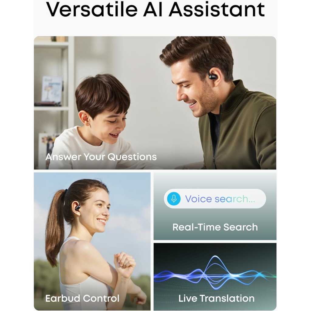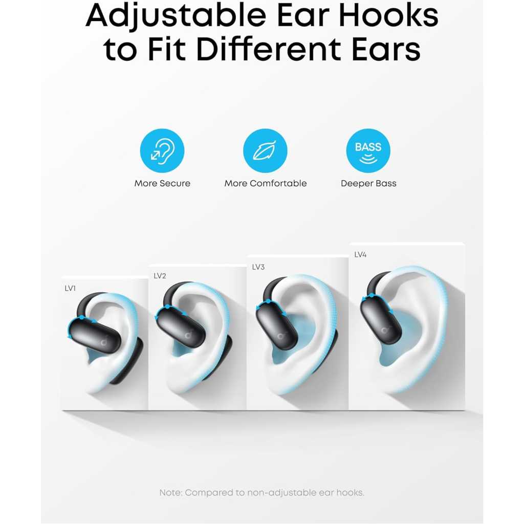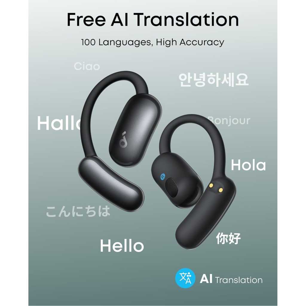 Key Features: Stay Comfortable, Stay Aware: With soft materials and a non-invasive design, the earbuds deliver all-day comfort and breathability, keeping you attuned to the world while enjoying music. Free Al Translation: Supports real-time translation with high accuracy in 100 languages globally. Whether on tropical vacations or at global conferences, stay in the loop wherever life takes you. Voice Control AI Assistant for Instant Help: Simply say “Hey Anka” and speak after the beep. Anka, our intuitive AI assistant, provides instant support to help you stay effortlessly productive. Enjoy free support at any time. Pressure-Free Fit for Every Ear: Double-curved surface and soundcore’s innovative 4-level adjustable ear hooks ensure a pressure-free fit tailored to over 99% of ear shapes and sizes. Vibrant Bass: Enjoy deep bass fueled by 20 mm × 11.5 mm racetrack drivers and BassTurbo acoustics. With Bluetooth 5.4 and LDAC support, experience stable, high-resolution audio transmission. Wireless Recharge, Long Playtime: Place the case on a wireless charger for tangle-free recharging. Get up to 8.5 hours of music on a single charge, extendable to 35 hours with the case.