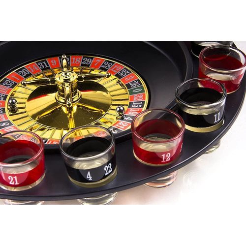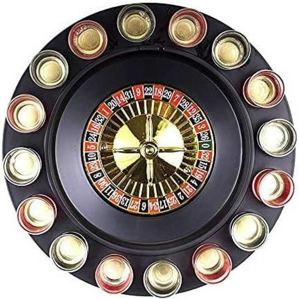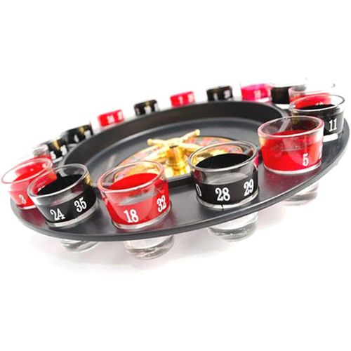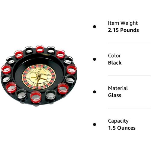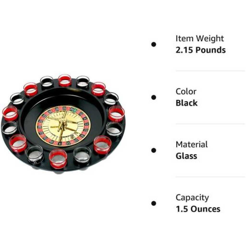 Key Features: Spin Wheel Roulette Set with Ball Fun Game Set (2 Balls and 16 Glasses) Casino Style Drinking Party Game -Multicolor Lucky Shot Glass Roulette – Drinking Game Set – 12 inches diameter The drinking games set includes a spinning roulette wheel, two balls, and 16 numbered glass shot glasses To play, simply turn the wheel to see whose number is up. If your shot glass corresponds to the number played, empty the glass and spin it again! Go ahead, play the fun and exciting game of drinking roulette no matter what number the ball lands on, everyone wins in this fun-drinking game of chance!