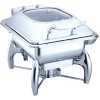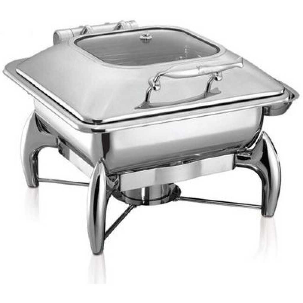 Stainless Steel Buffet Food Warmer Glass Lid Square Chafing Dish. Features a stainless steel, with a mirror-polish finish for a unique look, this SUPER DEAL chafer is designed for everyday use at your finest catered events. Use it to create a beautiful buffet setting without breaking the bank. Plus, whether you’re serving up a delectable egg bake or your signature side dish, this chafer will present it in style. Durable Construction Durable stainless steel construction ensures this chafer is built to withstand everyday use while providing a timeless appearance that blends in with your classic decor. Mirror Finish Each chafer features a highly-polished mirror finish that will shimmer in the ambient lighting of your venue. With its high quality finish, this chafer will add to the presentation value of any of the sides or entrees that you are serving! Sturdy Handles A sturdy handle on the cover makes for efficient service, while two handles on the chafer stand ensure easy transport. Broad Legs For optimum stability, a total of three broad, evenly-spaced legs keep the chafer sturdy on your buffet line. Elevated Fuel Stand The fuel stand is positioned close to the water pan. This helps maintain your food’s serving temperature for hours.
