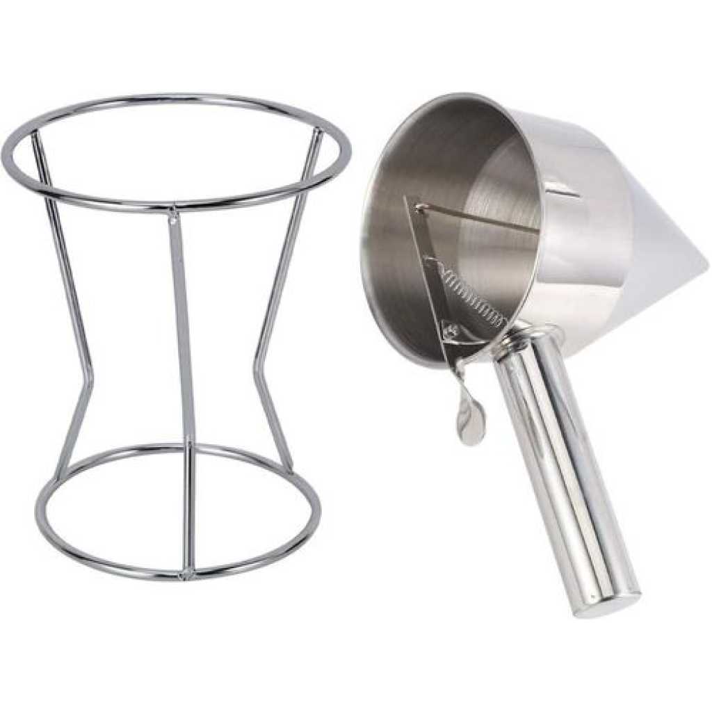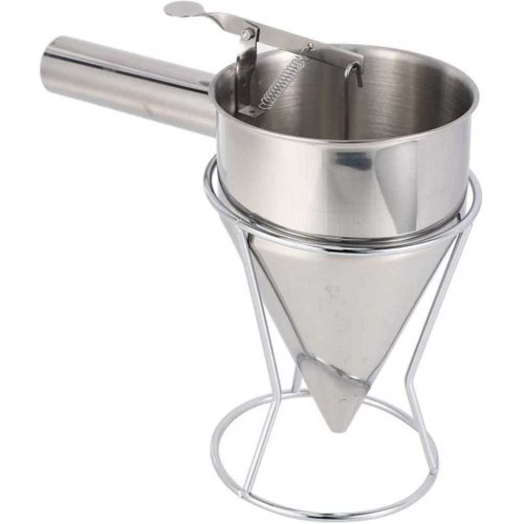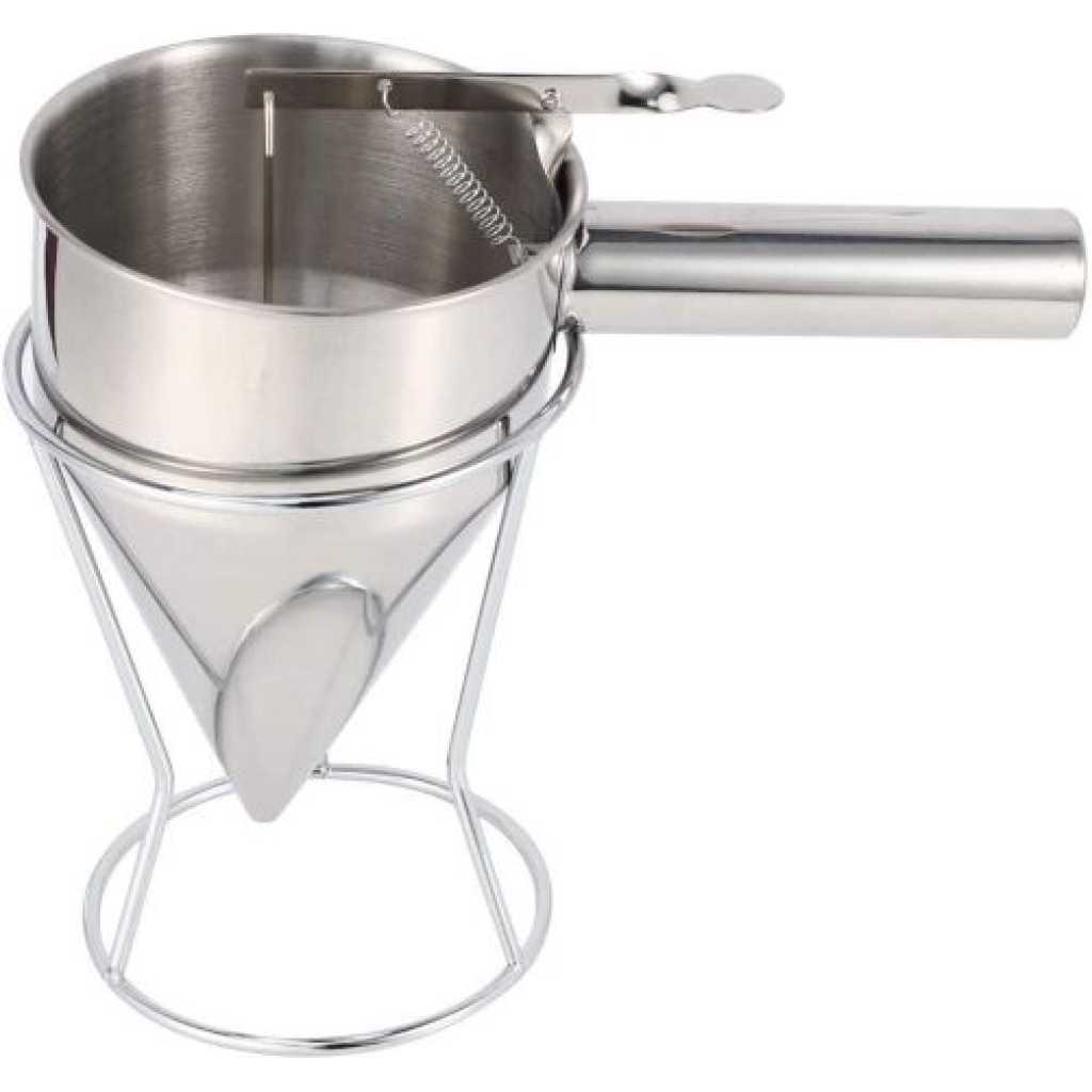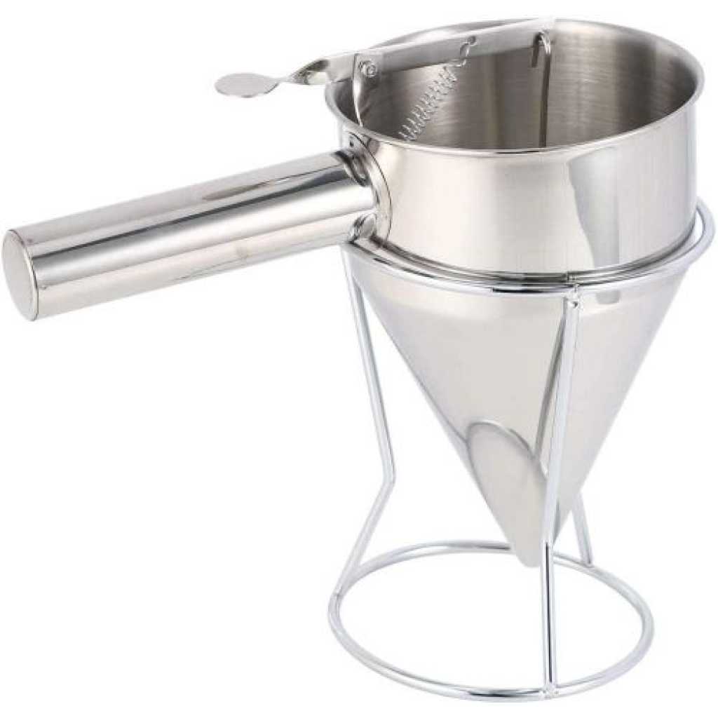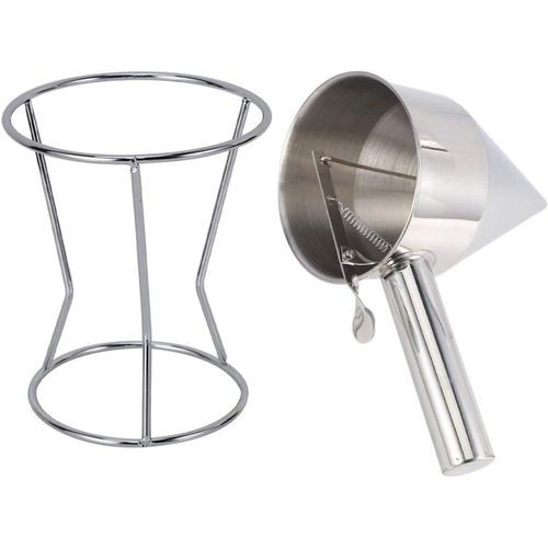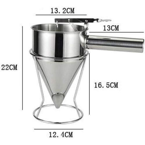 1. Great gift for anyone who loves pancakes. 2. Make perfect pancakes without the mess of bowls and spoons. Dispenses dough precisely for even pancakes every time. Also great for making crepes, waffles and cupcakes. 3. When you use it, please put it on a plate, the item will make a small drop after your pancake is made. 4. Equipped with an easy to control, spring-loaded handle that opens and closes the dispenser nozzle, you and your family will always be able to prepare perfectly portioned and consistent breakfast foods and desserts. 5. This gourmet chef tool is not only beautiful, it is made of sturdy, durable stainless steel. This dough pourer is an attractive addition to your kitchen that will last for years. Note: 1. The color of the item may be slightly different from the pictures shown due to the light and screen setting difference. 2. Due to manual measurement, there may be 1-2 cm deviation. Specification: Size: approx. 22 x 14 cm. Material: stainless steel. Applications: household, kitchen, hotel Colour: silver. Package includes: 1 x Pancake Dough Dispenser 1 x Frame Package includes: 1 x Pancake Dough Dispenser 1 x Frame Color: silver Material: steel Size: Upper diameter of the funnel: 13.5cm Height: 19.5cm Handle length: 12cm Package Content: 1 * steel funnel 1 * stents
