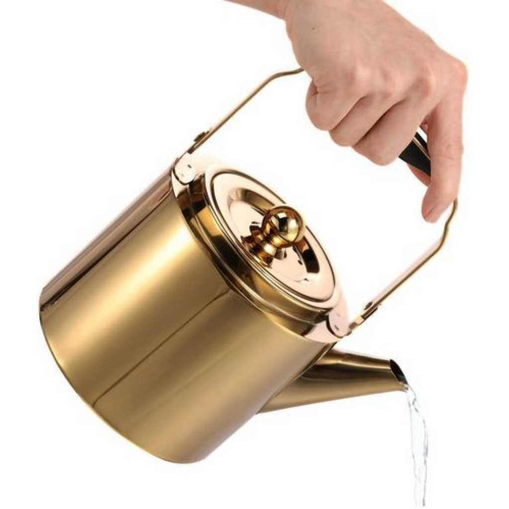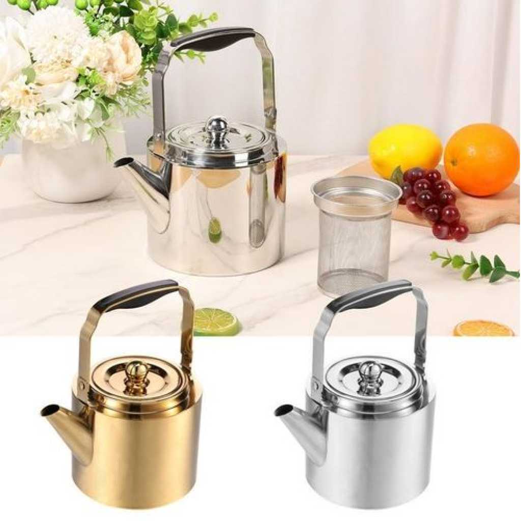 Product details Parts List: 1 x Tea Pot 1 x Tea Infuser Highlight description: Premium Material: Crafted from quality stainless steel , this teapot offers exceptional durability . Its versatile design allows use on induction cookers , gas stoves , electric heaters , ceramic hobs , and even charcoal stoves , meeting all your brewing needs Functional Spout Design: The innovative eagle style spout combines ergonomic comfort with practical functionality . Its unique shape ensures smooth pouring without drips while providing dust protection , bringing convenience to your daily tea time Generous Capacity: With a 1 .8L capacity , this teapot comfortably serves 3 to 6 people . Perfect for both personal use and entertaining guests , it meets all your serving requirements in one brew Removable Tea Infuser: The detachable infuser features a fine mesh filter that effectively strains tea leaves while allowing optimal water circulation for full flavor extraction Upgraded User Experience: The ergonomic handle provides a secure , non slip grip with heat resistant properties for comfortable handling . The energy concentrating base ensures fast , even heating to boil water quickly and save your valuable time Detailed description: Description Made of stainless steel , sturdy and enduring, the shape is not only ergonomic , but also has a capacity of 1 .8L , which can meet the drinking needs of 3 to 6 people . Key Feature Nonslip Design:The handle of this teapot is designed with a non slip grip , which is comfortable to hold , insulated and anti scalding , making it more comfortable to lift and put it away with less effort . Specification Product name: Stainless Steel Tea Pot Material: stainless steel Dimensions: Total height of pot 14.5cm(5.71 inch) Body height 11cm(4.33 inch) Handle height 11cm(4.33 inch) Base diameter 13.5cm (5.31 inch) Caliber 10.5cm(3.94 inch) Color(optional):Silver, Gold Notes: 1.There may be slight differences between the picture and the actual color of the commodity. We will try our best to show you the exact color. 2.Please allow slight dimension difference due to manual measurement. Premium Material: Crafted from quality stainless steel , this teapot offers exceptional durability . Its versatile design allows use on induction cookers , gas stoves , electric heaters , ceramic hobs , and even charcoal stoves , meeting all your brewing needs Functional Spout Design: The innovative eagle style spout combines ergonomic comfort with practical functionality . Its unique shape ensures smooth pouring without drips while providing dust protection , bringing convenience to your daily tea time Generous Capacity: With a 1 .8L capacity , this teapot comfortably serves 3 to 6 people . Perfect for both personal use and entertaining guests , it meets all your serving requirements in one brew Removable Tea Infuser: The detachable infuser features a fine mesh filter that effectively strains tea leaves while allowing optimal water circulation for full flavor extraction Upgraded User Experience: The ergonomic handle provides a secure , non slip grip with heat resistant properties for comfortable handling . The energy concentrating base ensures fast , even heating to boil water quickly and save your valuable time