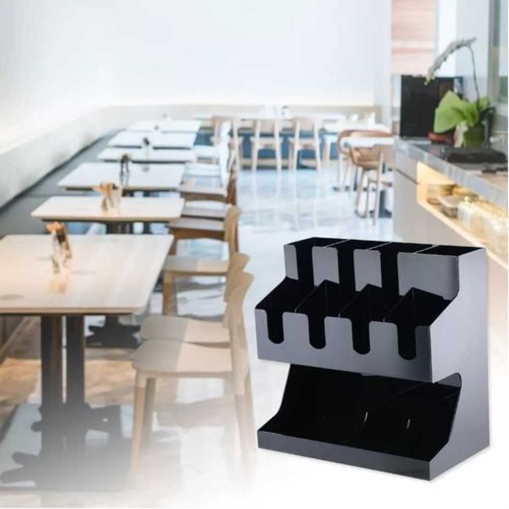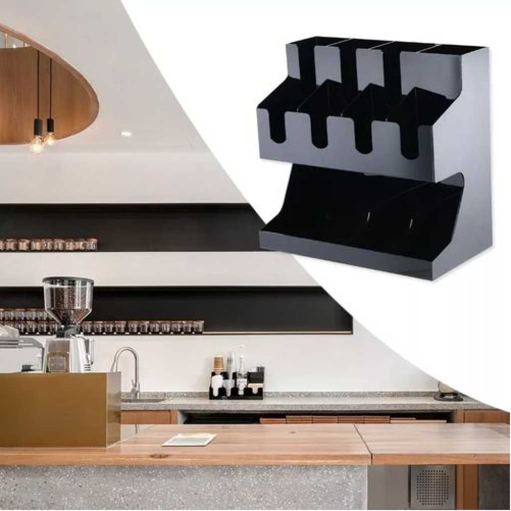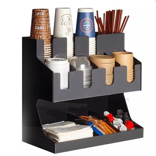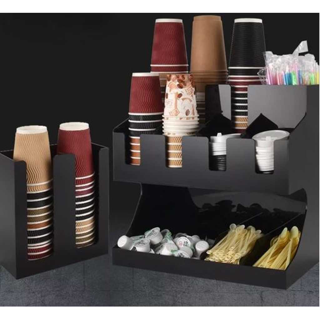 Key Features: Storage Rack Coffee Tea Bags Shop Cup Holder Grid Storage Organizer – Black. ULTIMATE COFFEE TEA CONDIMENT ORGANIZER: Complete condiment and beverage accessory solution organizes any size office breakroom or beverage space where employees gather to eat and drink at work. MULTI-SLOT MAKES IT EASY TO ORGANIZE: Three-tier vertical organizer features 5 compartments for coffee cups, tea cups, cups for water, coffee lids, sugar packets, tea bags, creamers, stirrers, or utensils. PERFECT FOR AT HOME, OFFICE, OR HOSPITALITY: Makes coffee and tea service areas easy to organize in hotel lobbies, motel breakfast service areas, at home on your kitchen counter, or at workspace saver organizer solution keeps condiments organized. VERSATILE ORGANIZER SPACESAVER: multi-compartment organizer helps to keep loose condiments, ketchup and mustard packets, paper clips, thumb tacks, rubber bands, and anything that needs organizing in their place until you’re ready to use. LIGHTWEIGHT AND DURABLE: durable constructions are food safe and easy to situate in the perfect spot on the work counter, kitchen counter, tabletop, or desk – can withstand day-to-day use of office employees, warehouse staff, hotel patrons, and more. EASY CARRY AND NON-SLIP: It’s easy to move this lightweight acrylic vertical organizer so that it’s close to coffee pots, hot water coolers, or anywhere you need this organizer to sit – use for traditional condiment organizer or to organize items as needed. PERFECT FOR DORMS AND COLLEGE: Students and teachers need organizers too – use in dorm rooms, and common areas where coffee, tea, hot chocolate, and hot water are served – keep near snacks and food. KITCHEN COUNTERTOP ORGANIZER: All kitchens need organizing and this is a sure way to organize those coffee pods – keep them on the counter or hide them away in kitchen cabinets if you’ve got the space and like things tucked away behind cabinet doors. EASY TO CLEAN: Keeping organizers is easy – simply wipe them clean with hot water.