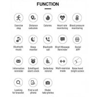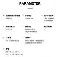 Key Features: Full Touch Screen Bluetooth Watch IP67 water and dust resistant Blood pressure measurement (tonometer) Blood oxygen level Heart rate sensor Call / SMS / social notifications Music player control Pedometer, Calorie Counter, Sleep Monitor Alarm clock, Calculator Detachable strap