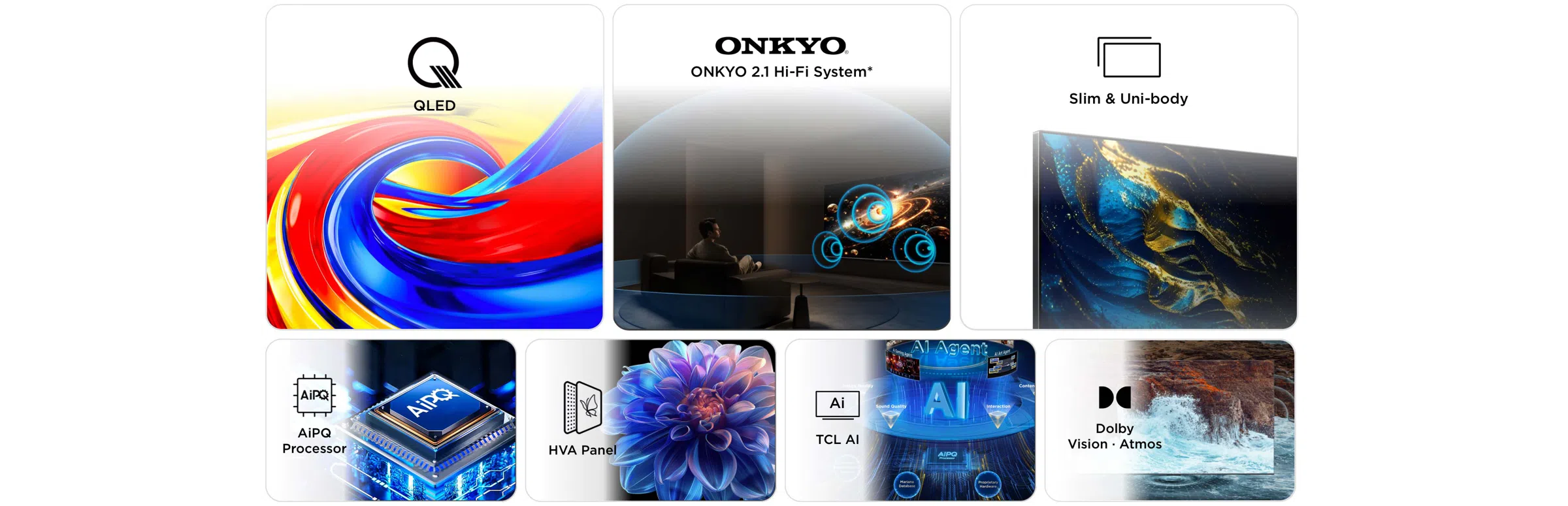 *To enjoy all smart features and services on your TCL Google TV, a Google Account, a free TCL Account, and a reliable broadband internet connection, are required. *Features, specs, certifications vary by model, screen size and region, and are subject to change at any time without notice. **ONKYO 2.1 Hi-Fi System is available on 85″ model. 75″ , 65″, 55″ , 50″ and the 43″ use 2.0 speakers.