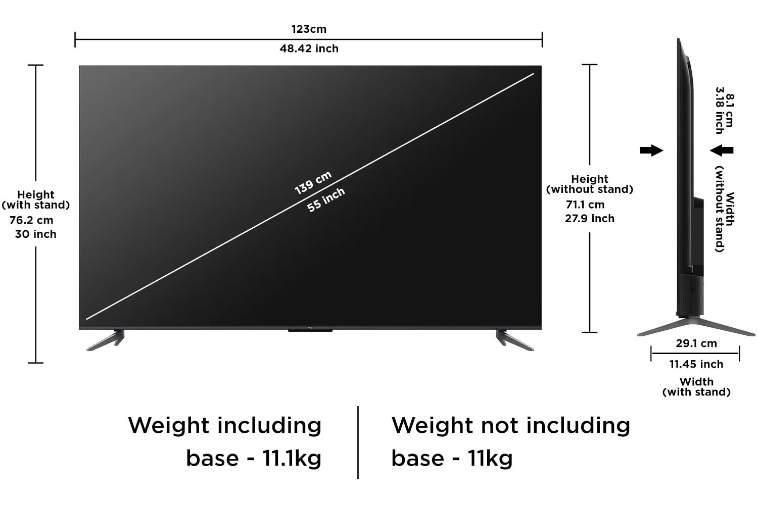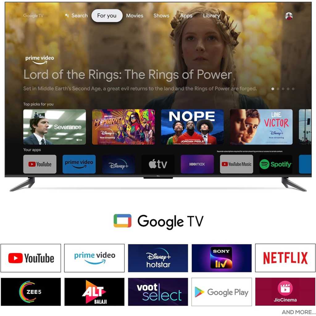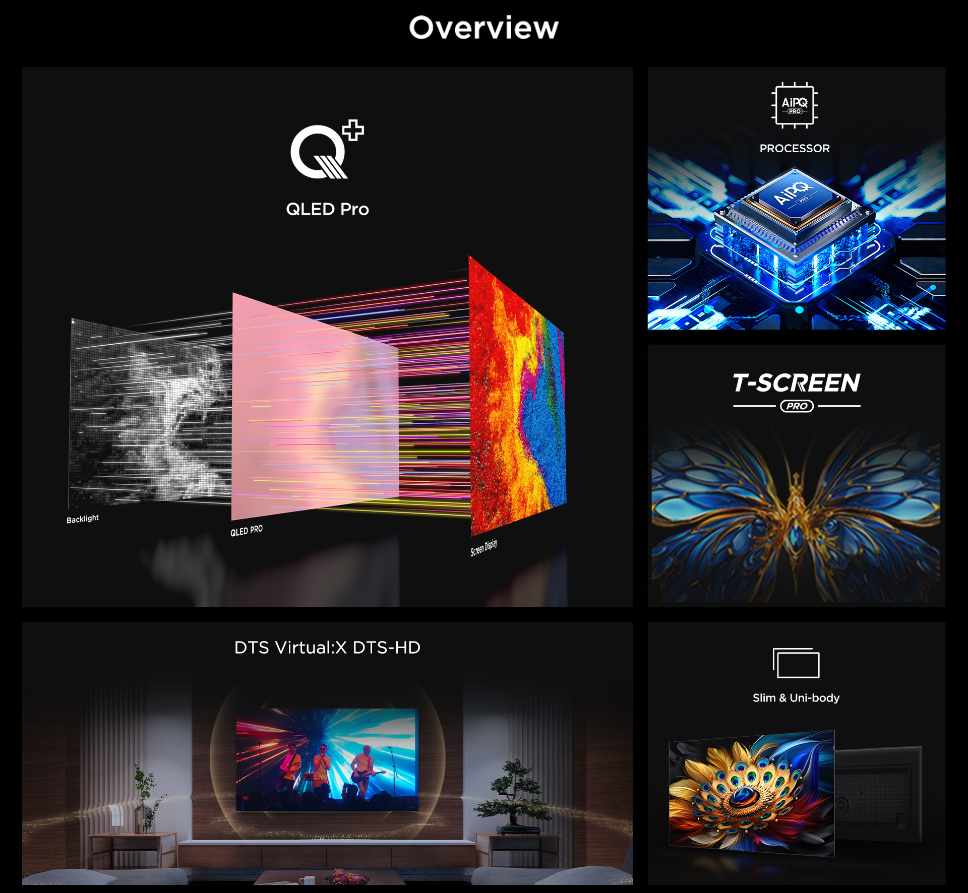 Key Features: · QLED PRO · AiPQ PRO PROCESSOR · T-SCREEN PRO · ONKYO 2.1CH · Slim & Uni-body · 144Hz VRR · Dolby Vision•Atmos · HDR10+ · Multiple Eye Care · 32GB Resolution: 4K Ultra HD (3840 x 2160) | Refresh Rate: DLG 120Hz | VRR 120Hz Connectivity: 3 HDMI Ports to connect set top box, Blu Ray players, gaming console | 1 USB ports to connect hard drive or other USB device | Ethernet | Wi-fi | Bluetooth | 1 Headphone output Sound: 35 Watts Output | DTS Virtual:X &Dolby Atmos Audio System Smart TV Features: Google TV | 2 GB RAM+32 GB ROM| DLG 120 Hz | Multiple Eye Care | ONKYO 2.1 CH | T-Screen Pro| Multiple Eye Care | DTS Virtual:X |Hands Free Voice Control Display: QLED Pro TV| Google TV| Dolby Vision -Atmos | HDR 10+ |AiPQ Pro Processor| T-SCREEN- PRO|Slim and Uni-Body Design |MEMC Warranty Information: 2 Year warranty provided by the manufacturer from date of purchase