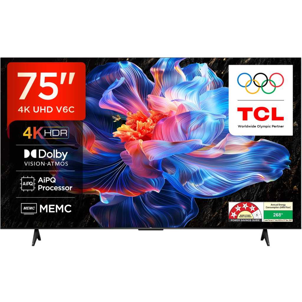 Key Features: TCL 75 Inch UHD 4K HDR Google TV 75V6C; (2025 Model),120Hz Refresh Rate, Smart Android LED TV, AiPQ Processor, Works With Alexa, HDR10+, Motion Clarity, UniBody Design, Bluetooth, Youtube, Netflix, Prime Video, Google Play, Chromecast Built-In, With Inbuilt Free To Air Decoder – Black. 4K HDR · Direct LED · HVA Screen · AiPQ Processor · Multi HDR Format · 120Hz Game Accelerator in FHD resolution · Dolby Atmos · Google TV · Hands-Free Google Assistant · Works with Alexa