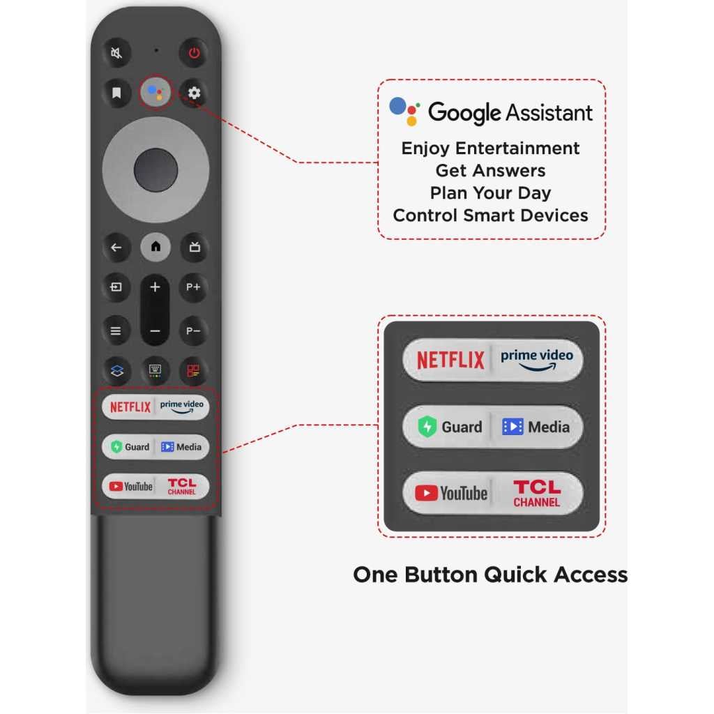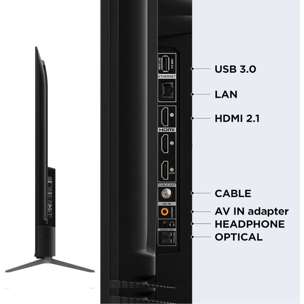 Key Features: · QLED PRO · AiPQ PRO PROCESSOR · T-SCREEN PRO · ONKYO 2.1CH · Slim & Uni-body · 144Hz VRR · Dolby Vision•Atmos · HDR10+ · Multiple Eye Care · 32GB Resolution: 4K Ultra HD (3840 x 2160) | Refresh Rate: DLG 120Hz | VRR 120Hz Connectivity: 3 HDMI Ports to connect set top box, Blu Ray players, gaming console | 1 USB ports to connect hard drive or other USB device | Ethernet | Wi-fi | Bluetooth | 1 Headphone output Sound: 35 Watts Output | DTS Virtual:X &Dolby Atmos Audio System Smart TV Features: Google TV | 2 GB RAM+32 GB ROM| DLG 120 Hz | Multiple Eye Care | ONKYO 2.1 CH | T-Screen Pro| Multiple Eye Care | DTS Virtual:X |Hands Free Voice Control Display: QLED Pro TV| Google TV| Dolby Vision -Atmos | HDR 10+ |AiPQ Pro Processor| T-SCREEN- PRO|Slim and Uni-Body Design |MEMC Warranty Information: 2 Year warranty provided by the manufacturer from date of purchase