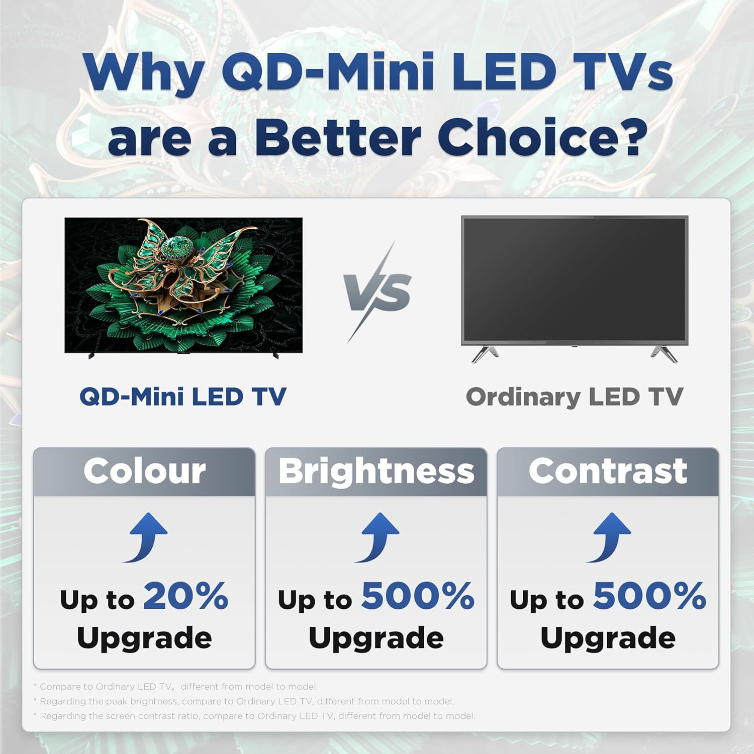The TCL C7K QD-Mini LED TV delivers an immersive home entertainment experience with cutting-edge display technology, intelligent processing, and high-fidelity sound. Featuring QD-Mini LED technology, this TV combines Quantum Dot and Mini LED innovations to provide precise backlighting, deep contrast, and an extensive colour spectrum. The result is a vibrant, true-to-life picture with enhanced brightness and rich detail, ensuring a stunning visual experience in any lighting condition. Powered by the AiPQ Pro Processor, the C7K intelligently optimises picture and sound in real time, refining clarity, sharpness, and depth for a more dynamic and engaging experience. With a 120Hz native refresh rate, motion remains smooth and fluid, making it perfect for action-packed movies, sports, and gaming. Audio is just as impressive, with a Bang & Olufsen premium audio sound system that delivers deep bass and crystal-clear stereo sound. Whether watching a blockbuster or gaming, the soundstage is rich, immersive, and theatre-like. Designed with a sleek, modern aesthetic, the C7K complements any living space while offering exceptional performance. Its combination of premium display technology, intelligent processing, and immersive sound makes it an outstanding choice for those who demand the best in home entertainment.