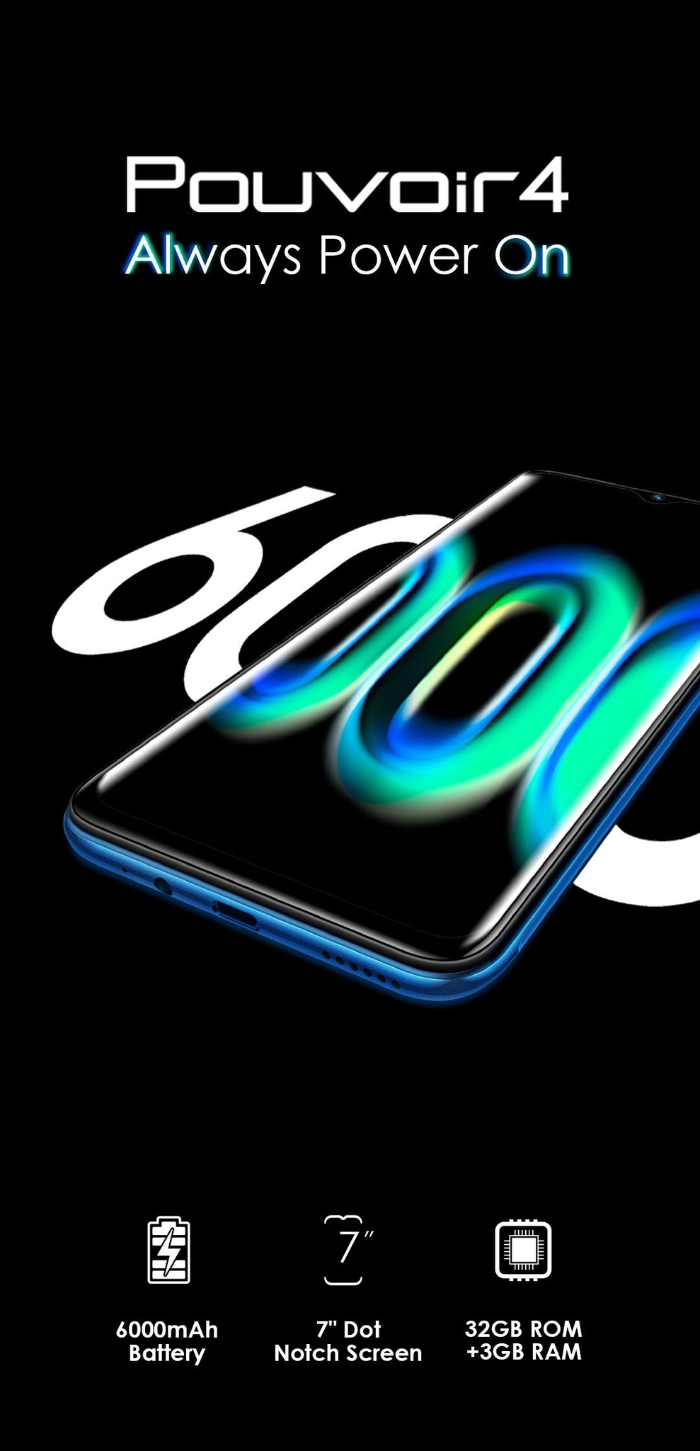 6000mAh Battery 6000mAh super battery, long standby for 4 days, perfectly meets your various needs of power supply for daily routines. Truly powerful enjoyment. 7” Dot Notch Screen Cinematic-like visual experience on 7” Dot Notch Screen is here! More exciting entertaining enjoyment, letting you immersed in stunning video effects. Dual Stereo SpeakerDual stereo speaker and digital sound effects based on acoustic measurement and correction bring you high quality immersive entertaining experience no matter you are using earphones or playing it out loud. 32GB ROM + 3GB RAM32GB ROM provides enough space for you to store your favorite files. 3GB RAM ensures better gaming experience, fluent and fast, no more delay. Gaming and multitasking have become smoother and easier. Magic KeySpecial design of volume key. We made it as the Fire key with fancy animation effect in order to promote the shooting experience and accuracy in the gameplay. Off Screen ModeAiming at hook games, off screen mode enables you to run the game even when the screen is off, saving more than 50% power. Game Mode OptimizationGame mode has significantly improved with better interactive experience. Message optimization lets you quickly browse the important messages without disturbing your gaming experience and winning records. AI Quad Camera13MP clear lens working with F/1.8 big aperture, every shot taken by Pouvoir 4 would be clear and bright enough. Supporting 8X digital zoom function and 77° shooting angle, keeping grand scenery and its details are all within reach. High Definition Video RecordingThe 13MP clear lens also supports high definition video recording. Better light recognition presents more details even in low light scenarios, ensuring fine output quality. 4cm Macro PhotographyThe close-up shot lets you discover the unseen beauty of the minor things around you. Reveal the wonders of nature in every little details. AI Bokeh EffectBackground Bokeh Effect has been fully upgraded, giving portraits better focus in the whole picture along with processing details carefully. AI Selfie CameraFeatured with 8MP AI Selfie Camera and excellent camera sensitive elements, every shot gives a clear and beautiful selfie. F/2.0 big aperture captures more light from the environment. 81° selfie angle enables you to take wider selfie, big portrait of family and friends is easier to get. Brighter in Low Light ScenarioDual front flash + Quad rear flash, effectively solves the problem of dim photos in low light environments. Adjustable flash design enables you choose the brightness as you like. The flashes also work in video recording status. Fearless of the dark scenarios, photos and videos would always be bright and clear. Colorful design + Elegant appearanceGetting inspiration from river of stars, Pouvoir 4 offers three stunning gradient colors for you to choose. Exquisite textural lines and colors collide and change in different environment light. Continuing the style of business and technology, adhering to the straight and elegant design ideas, the whole appearance of Pouvoir 4 shows the essence of cool and gentle. Dark themeNew Dark Theme not only reduces the screen’s irritation to the eyes, but also saves energy and extends battery life effectively. Initiating An Approach to Smart LifeClick the Google Assistant Button on the body side, and tell it what you want. News, messages reminder, weather broadcast, alarm, translation and more daily functions could be activated. Information in different fields are easily searched and found.