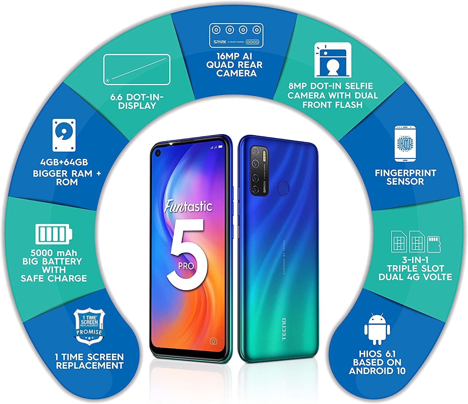 Introducing the powerful Spark 5 Pro – with premium dot-in design and 6.6” big display for the trend setters of today. Spark 5 Pro is equipped with 5 cameras including a whooping 16MP AI Quad camera with f1.8 aperture in the rear for fantastic photography which is not common in this segment. Enjoy smooth experience with Spark 5 Pro as it also comes with large 4GB, 64GB internal storage and powerful 5000mAh battery About this item 16MP AI Quad Rear camera with 16+2+2+AI Lens Quad AI Camera, AI Body Shaping, Macro Shot, Auto Scene Detection, Bokeh mode, AR mode, Quad Flash, AI HDR, AI beauty, inbuilt google lens | 8MP front facing camera with dual front flash 16.764 centimeters (6.6-inch) HD+ TFT TDDI with 720 x 1600 pixels HD resolution, 268 ppi pixel density and 90.2% Screen body ratio, 20:9 wide aspect ratio, 480nits super brightness Memory, Storage & SIM: 4GB RAM | 64GB internal memory expandable up to 256GB | Dual SIM (nano+nano) dual-standby (4G+4G) Android v10 operating system with 1.8GHz MediaTek Helio A25 octa core processor, IMG GE 8300 up to 600MHz 5000mAH lithium-polymer battery providing talk-time of 31 hours and standby time of 480 Hours 1 time Screen Replacement, 1 year manufacturer warranty for device and 6 months manufacturer warranty for in-box accessories including batteries from the date of purchase Big 6.6″ Dot-In full display for Funtastic Entertainment | Fast performance and bigger storage with 4GB RAM + 64GB ROM Tecno Spark 5 Pro smartphone comes with a 6.60-inch touchscreen display with a resolution of 720×1600 pixels, 3GB of RAM, 64GB internal Storage and is powered by a 5000 mAh non-removable battery. Order for this Tecno Spark 5 Pro online from Jumia Uganda and have it delivered to your doorstep. Clear & Bright Photography A brand-new algorithm AI Camera 3.0 on 13MP main camera with F/1.8 big aperture enables highly clear and more natural photos whether it is daytime or night. Quad rear flash effectively solves the problem of dim photos in dark environments, giving you clearer, brighter and beautiful shots. AI Scene Detection 10 different scene detection fully cover both simple and mixed scenes at the same time. Once the scene is recognized, it would offer corresponding AI optimization, letting you take more realistic and detailed photos. AI HDR AI HDR controls the light part from getting overexposed, showing more detailed and crisp dark parts. The fog removal algorithm improves the overall selfie effect. The colour output is loss less and presents every details, making the selfie portrait more colorful and vivid. Wider and Better AI Bokeh Effect Background Bokeh Effect has been fully upgraded, giving portraits better focus in the whole picture along with processing details carefully. 8MP AI Selfie Camera Loaded with 8MP Al Selfie Camera, SPARK 5 Air is always ready to capture your shining moments. With dual front flash and Portrait HDR, brighter and charming selfie in a low light scenario is within your reach. Fully developed facial algorithm saving your time for retouches, offering a smoother and funnier selfie experience. AI Beauty Mode Presetting three kinds of localized beauty effects, skin polishing and intelligent brightening are all a part of the AI Beauty Mode. Various adjustments on UI interface have been done and now support a real-time preview in one click. Wide Selfie When taking selfie with family or friends, adjust the angle of the phone according to the screen instructions, the camera would capture everyone and give you a brilliant wide selfie photo. 7 Inch Dot Notch Screen Extraordinary 7 Inch Dot Notch Screen is here! High resolution, 88% comfortable screen ratio, 480 nits brightness, truly clearer, wider and brighter screen. Enjoy limitless fun with a broader view. New HiOS 6.0 New HiOS 6.0 based on Android Q is here, with improved OS performance and user experience Social Turbo Best WhatsApp Assistant Box with multiple features is available to make chatting fun with friends. A powerful tool box that can make your DIY Emoji, save present WhatsApp status, and automatically open flash while you have incoming WhatsApp call. More advanced features have. 4G VoLTE Now you could have super-clear voice quality calling with your family and friends when both phones use this function. (*The network operator should support this function.) Design New pattern design and fantastic gradient color choices make new SPARK 5 Air easily catch everyone’s attention. More choices for your unique style. 5000mAh Great Power Say goodbye to your power bank. 5000mAh powerful battery and smart power-saving system satisfy your needs of staying juiced up for daily work and life. 32GB ROM + 2GB RAM 32GB ROM offers enough space to store your favorite photos and important files. 2GB RAM provides stable and smooth performance with our system. Multitasking has become easier and faster. Face Unlock 2.0 Automatically detect your closed eyes, greatly improving your phone privacy and security.