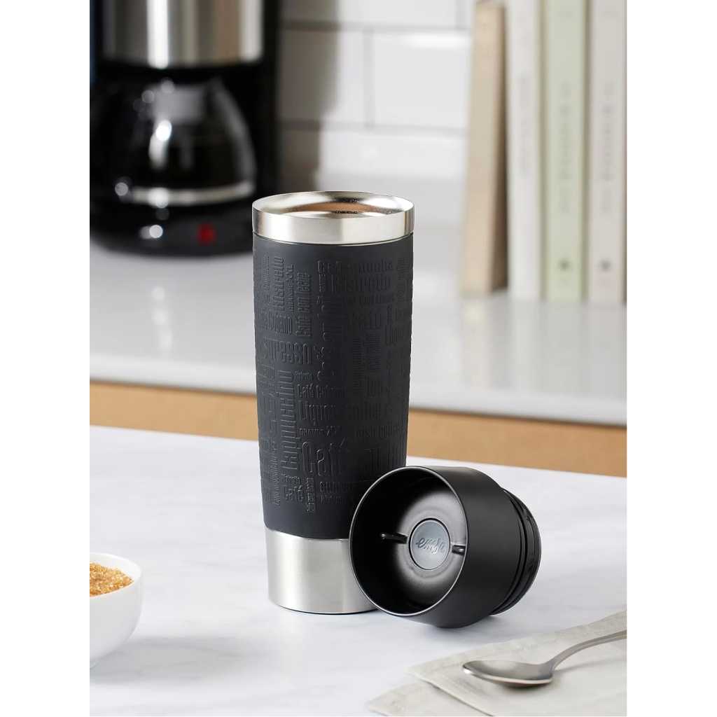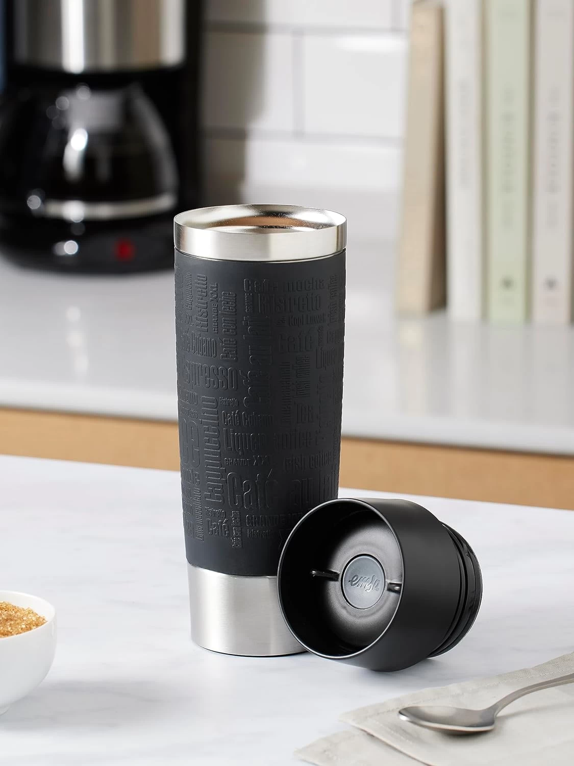 Tefal 0.5L Thermal Travel Mug K3081214 – Black. For Drinks on the go: This large vacuum flask is the ideal companion for your drinks on the go: Take your hot coffee, tea or cold drinks with you wherever you go Easy Drinking: Thanks to the 360 Degree circular drinking aperture so you can drink from any direction Easy to take away: The 100 Percent leakproof thermal bottle comes with a handy quick press seal and can be easily opened with the press of a button Suitable conservation: Keep your beverages hot for up to 6 hours or cold for up to 12 hours 100 Percent Harmless: This ecodrink is BPA Free, dishwasher safe and is an environmentally-conscious option to avoid plastic bottles