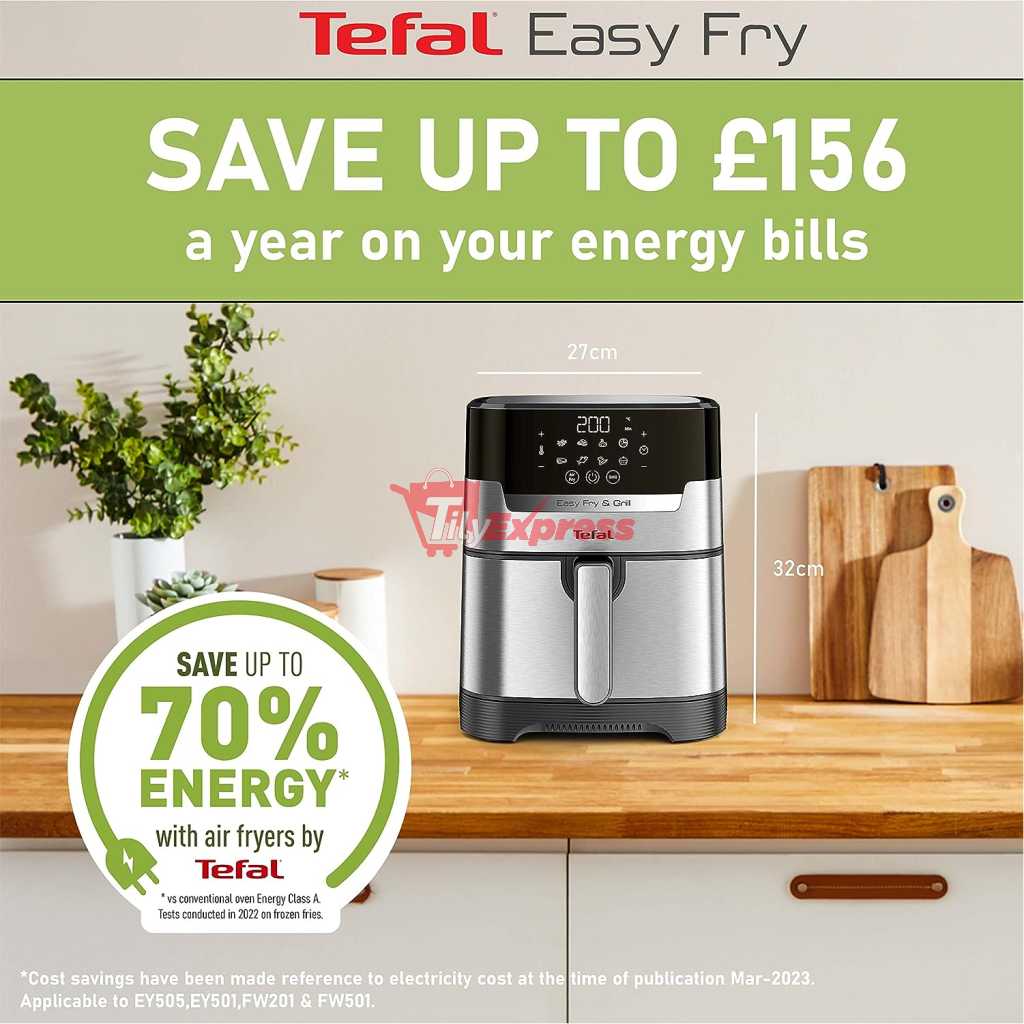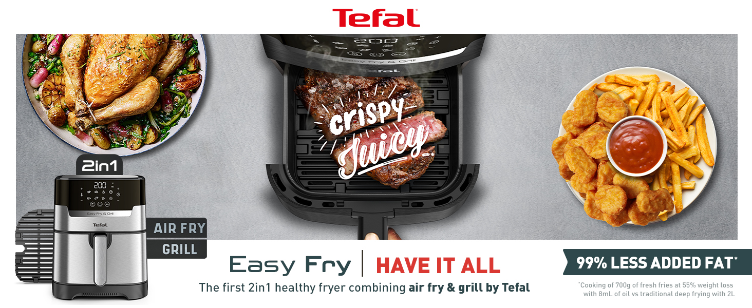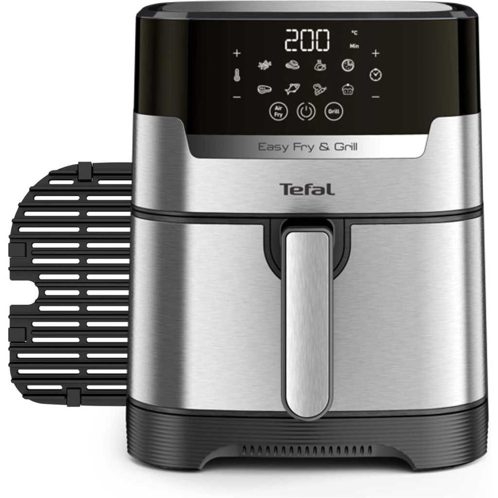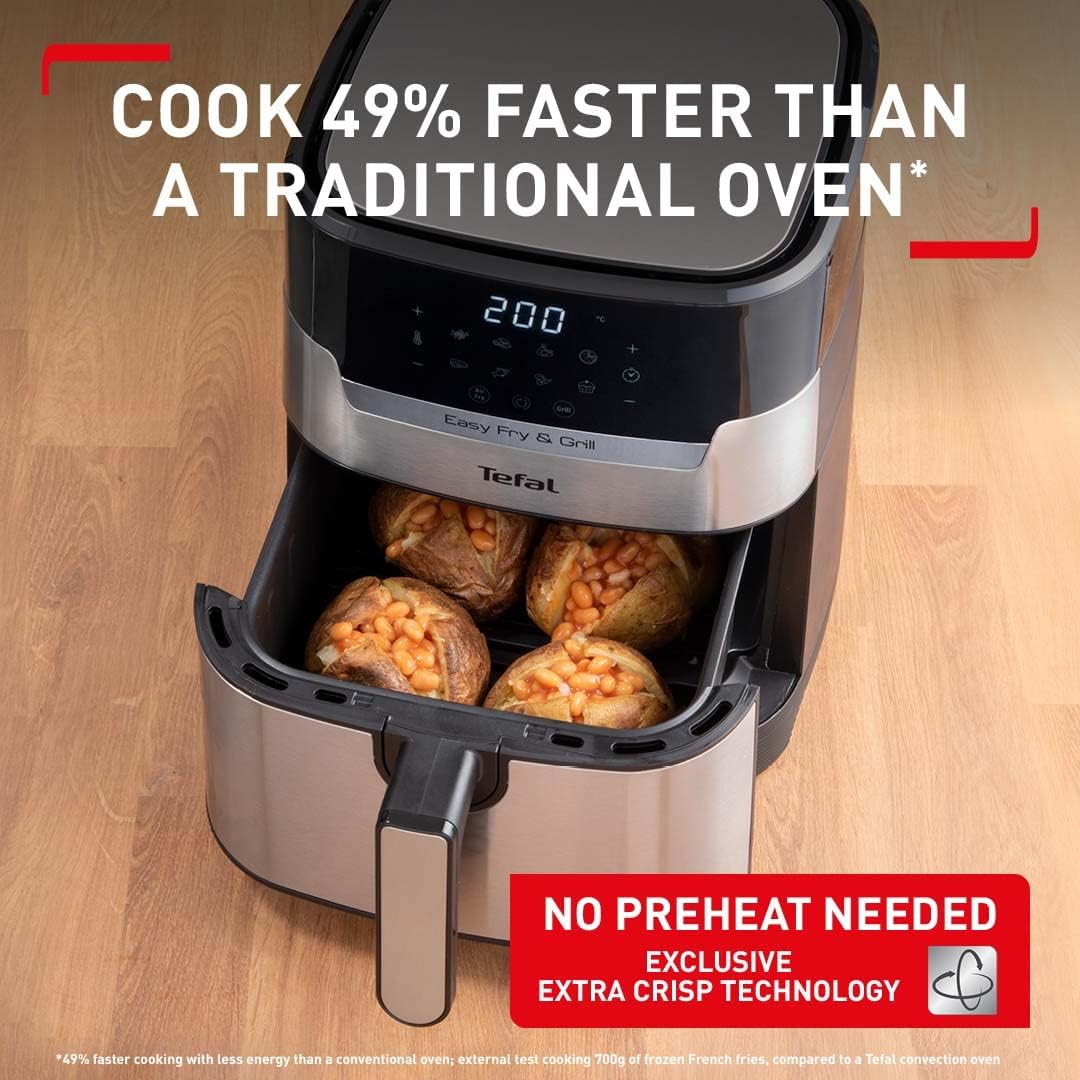 Key Features: Tefal 4.2L Easy Fry Precision+ 2-in-1 Digital Air Fryer and Grill; 8 Programs inc Dehydrator Stainless Steel EY505D, 1550W. 2 WAYS TO COOK: Tefal’s first digital stainless-steel air fryer and grill in one. Exclusive Extra Crisp air frying technology maximises the crispiness of your food without compromising on flavour and moisture COOK FASTER AND SAVE ENERGY: Prepare a wide variety of meals 49% faster* than in a conventional oven, get that crispy crunch and taste you love in half the amount of time. Save up to 70% energy** whilst saving up to £156 on your energy bills NO PREHEAT NEEDED: Extra Crisp air frying technology delivers instant heat, so there’s no need for preheating. Just choose from 8 automatic programs or set your own temperature (80-200°C) and time (<60mins) and start cooking straight away SMOKELESS INDOOR GRILLING: Enjoy grilling indoors with 98% less smoke***. Get that juicy grilling taste with our one-of-a-kind, die-cast aluminium Sizzling Grill Plate A HEALTHIER ALTERNATIVE: Air frying offers a quick and easy way to make healthy versions of all your favourite foods – fresh or frozen. From crispy chips and juicy burgers to grilled halloumi and falafel. And all with 99% less added fat**** NO OVEN REQUIRED: Cooking crisp, tasty food faster than an oven (and with less faff!), Easy Fry Precision 2-in-1 brings a new meaning to ‘fast food’. Enjoy crispy and juicy chicken thighs in just 20 minutes versus 40 minutes in a conventional oven EASY CLEAN: With its clever easy-to-clean design, Tefal Easy Fry makes mealtimes a cinch. Simply pop the drawer and grill plate straight in the dishwasher – job done! Then sit back and enjoy your delicious dinner knowing clean-up is taken care of