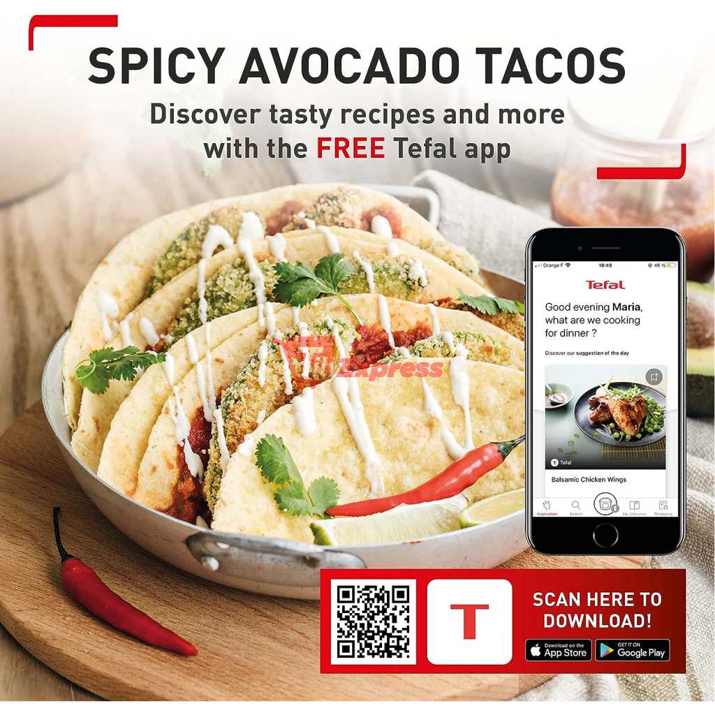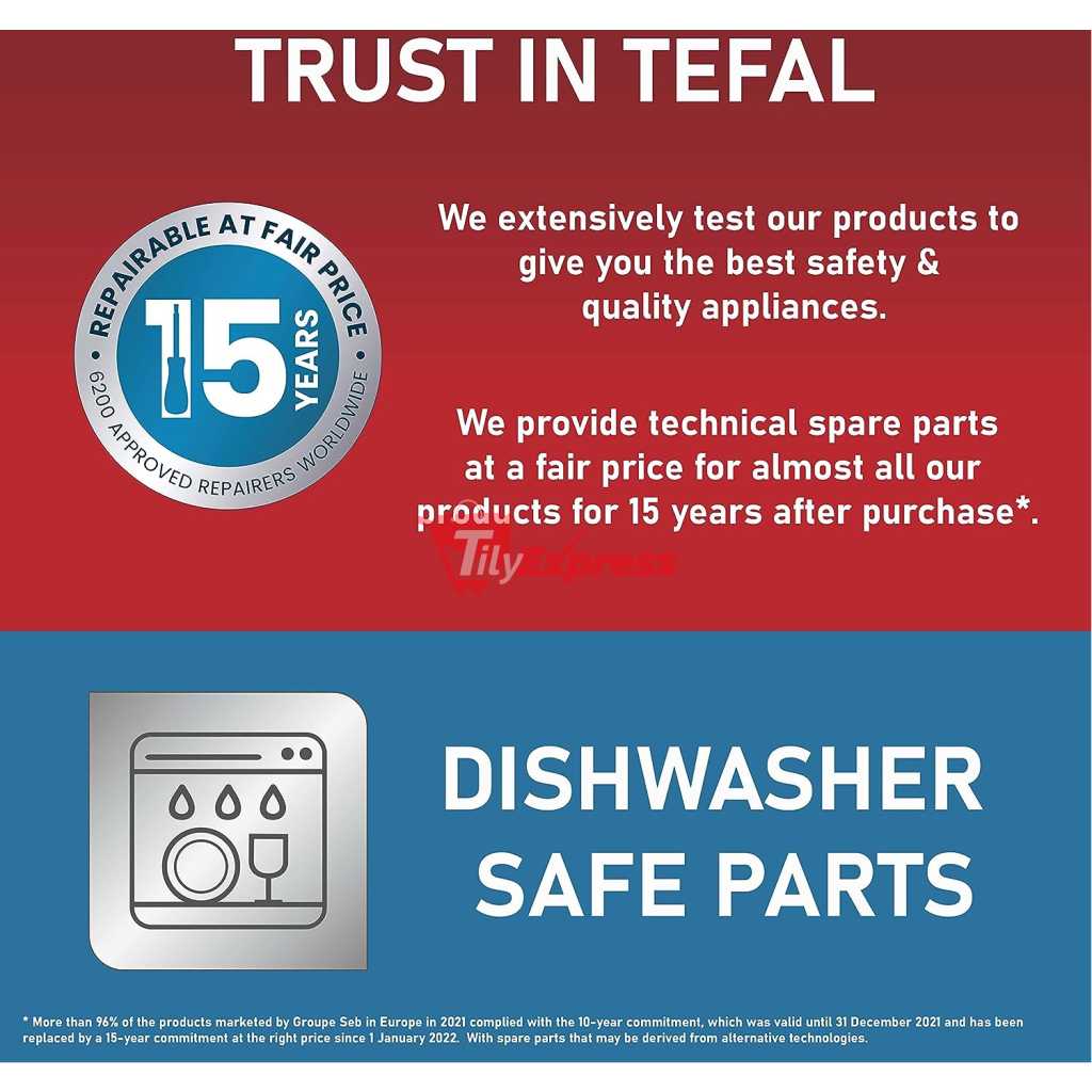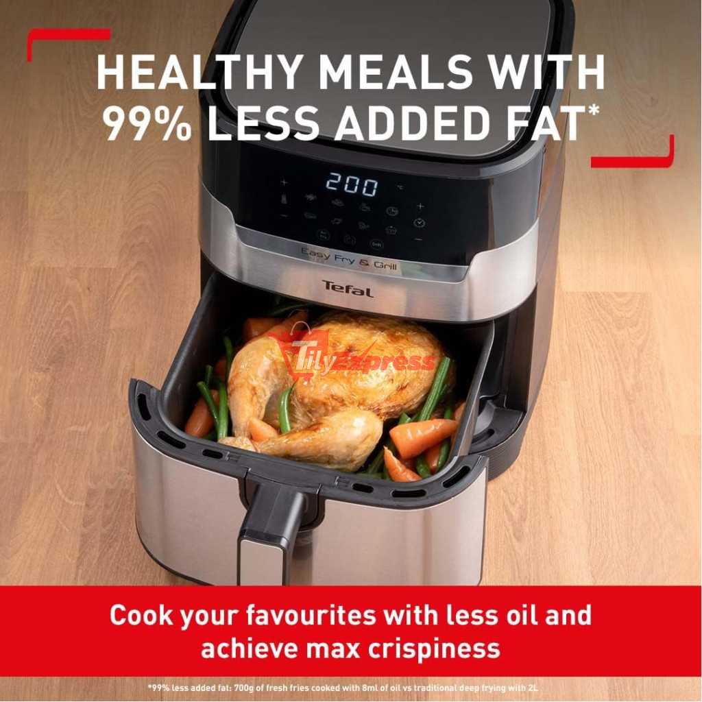 Key Features: Tefal 4.2L Easy Fry Precision+ 2-in-1 Digital Air Fryer and Grill; 8 Programs inc Dehydrator Stainless Steel EY505D, 1550W. 2 WAYS TO COOK: Tefal’s first digital stainless-steel air fryer and grill in one. Exclusive Extra Crisp air frying technology maximises the crispiness of your food without compromising on flavour and moisture COOK FASTER AND SAVE ENERGY: Prepare a wide variety of meals 49% faster* than in a conventional oven, get that crispy crunch and taste you love in half the amount of time. Save up to 70% energy** whilst saving up to £156 on your energy bills NO PREHEAT NEEDED: Extra Crisp air frying technology delivers instant heat, so there’s no need for preheating. Just choose from 8 automatic programs or set your own temperature (80-200°C) and time (<60mins) and start cooking straight away SMOKELESS INDOOR GRILLING: Enjoy grilling indoors with 98% less smoke***. Get that juicy grilling taste with our one-of-a-kind, die-cast aluminium Sizzling Grill Plate A HEALTHIER ALTERNATIVE: Air frying offers a quick and easy way to make healthy versions of all your favourite foods – fresh or frozen. From crispy chips and juicy burgers to grilled halloumi and falafel. And all with 99% less added fat**** NO OVEN REQUIRED: Cooking crisp, tasty food faster than an oven (and with less faff!), Easy Fry Precision 2-in-1 brings a new meaning to ‘fast food’. Enjoy crispy and juicy chicken thighs in just 20 minutes versus 40 minutes in a conventional oven EASY CLEAN: With its clever easy-to-clean design, Tefal Easy Fry makes mealtimes a cinch. Simply pop the drawer and grill plate straight in the dishwasher – job done! Then sit back and enjoy your delicious dinner knowing clean-up is taken care of