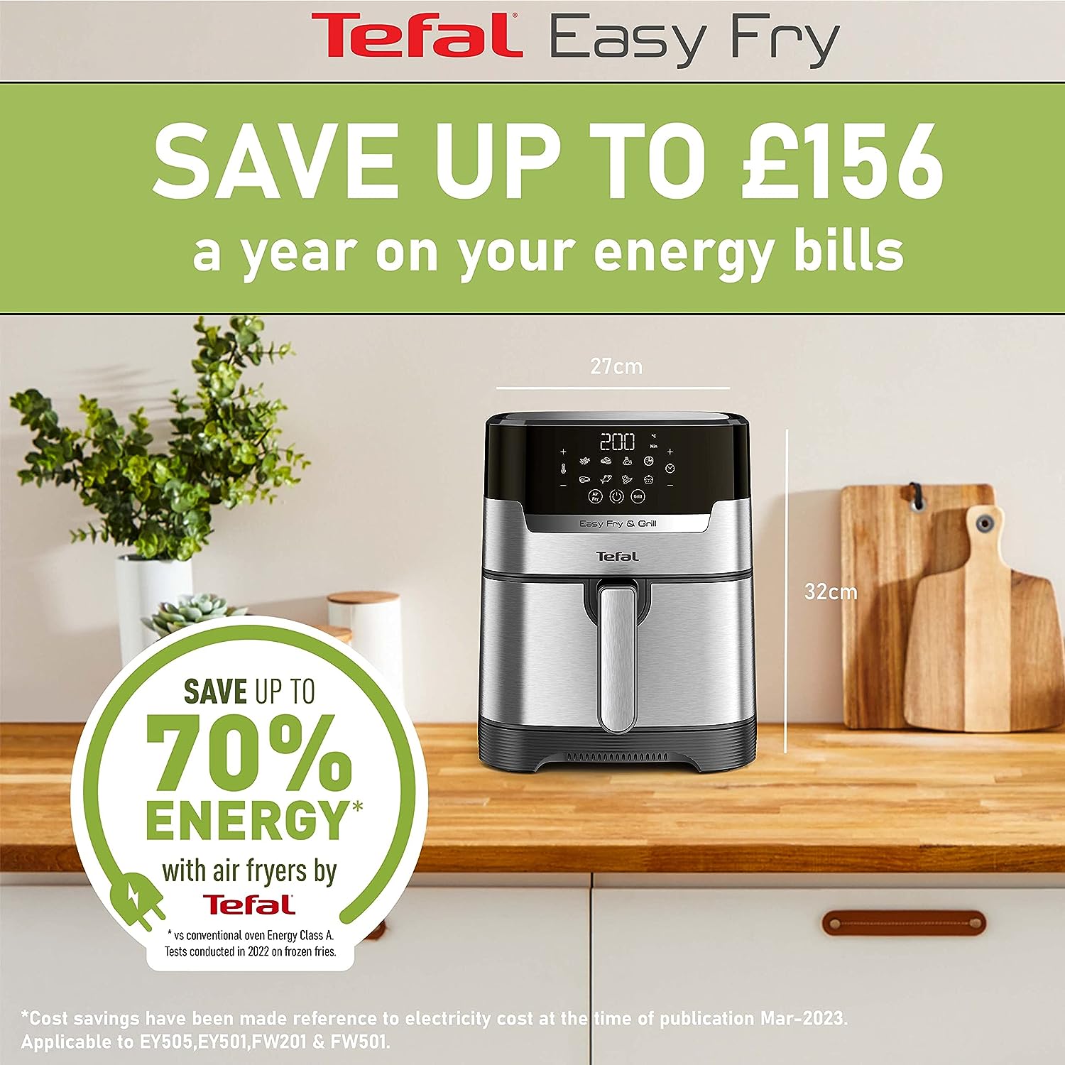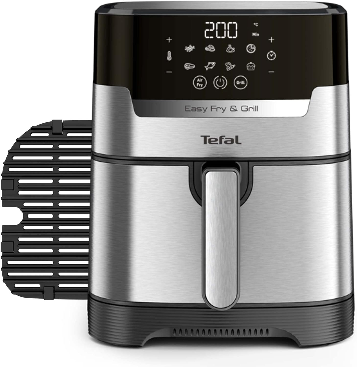 Tefal 4.2L Easy Fry Precision+ 2-in-1 Digital Air Fryer and Grill; 8 Programs inc Dehydrator Stainless Steel EY505D, 1550W. 2 WAYS TO COOK: Tefal’s first digital stainless-steel air fryer and grill in one. Exclusive Extra Crisp air frying technology maximises the crispiness of your food without compromising on flavour and moisture COOK FASTER AND SAVE ENERGY: Prepare a wide variety of meals 49% faster* than in a conventional oven, get that crispy crunch and taste you love in half the amount of time. Save up to 70% energy** whilst saving up to £156 on your energy bills NO PREHEAT NEEDED: Extra Crisp air frying technology delivers instant heat, so there’s no need for preheating. Just choose from 8 automatic programs or set your own temperature (80-200°C) and time (<60mins) and start cooking straight away SMOKELESS INDOOR GRILLING: Enjoy grilling indoors with 98% less smoke***. Get that juicy grilling taste with our one-of-a-kind, die-cast aluminium Sizzling Grill Plate A HEALTHIER ALTERNATIVE: Air frying offers a quick and easy way to make healthy versions of all your favourite foods – fresh or frozen. From crispy chips and juicy burgers to grilled halloumi and falafel. And all with 99% less added fat**** NO OVEN REQUIRED: Cooking crisp, tasty food faster than an oven (and with less faff!), Easy Fry Precision 2-in-1 brings a new meaning to ‘fast food’. Enjoy crispy and juicy chicken thighs in just 20 minutes versus 40 minutes in a conventional oven EASY CLEAN: With its clever easy-to-clean design, Tefal Easy Fry makes mealtimes a cinch. Simply pop the drawer and grill plate straight in the dishwasher – job done! Then sit back and enjoy your delicious dinner knowing clean-up is taken care of Technical Details