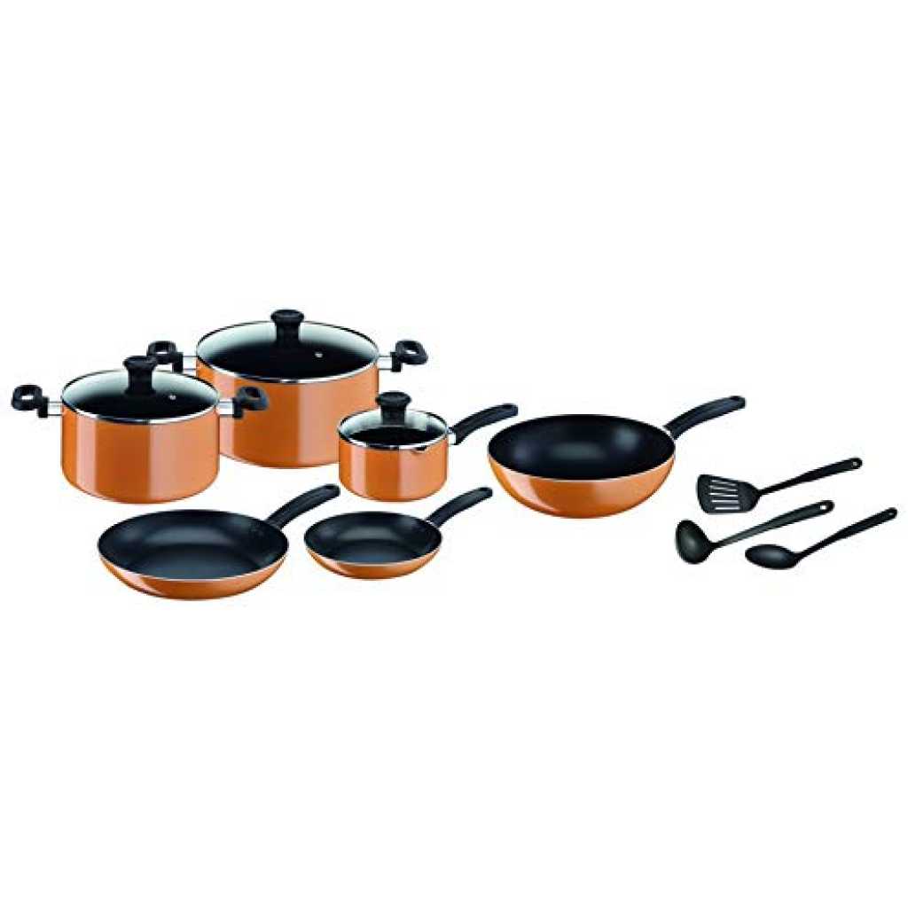 Key Features: Tefal B168A574 15Pieces New Prima Cooking Set, Orange/Black, Aluminium Features and functions prometal: high resistance and non-Stick coating. 2, 5 mm thick aluminium for fast and even heating thanks to prometal coating, classic wokpan is really easy to clean compatible with all stovetops (gas, electric, ceramic) except induction Set includes. Saucepan 18 cm with glass lid. Stewpots 24 and 30 cm with glass lid. Frypans 24 cm and frypan 28 cm. Wok 36cm. Sautepan 24 cm with glass lid. Slotted spoon. Long spatula. Laddle. Skimmer.