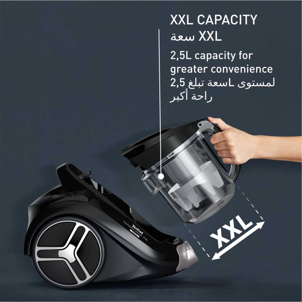Tefal Bagless Vacuum Cleaner, Compact Power, XXL Animal Kit Canister, Vacuum Cleaner, 900 W Low Consumption Motor, Advanced 3-Level Cyclonic Filtration, 2 Years Warranty, TW4B71HA Brand Tefal Special features Bagless Filter type Cartridge Surface recommendation Carpet, Hard Floor, Upholstery Power source dual_powered XXL CLEANING PERFORMANCE: A bagless vacuum cleaner that delivers impressive suction with advanced cyclonic technology and a 900 W max low-consumption* motor for perfect cleaning results (*according to (EU) N°666/2013) XXL CAPACITY: An impressive 2.5 L capacity to cover all sizes of living spaces, for a canister vacuum cleaner that offers greater autonomy and convenience COMPACT DESIGN: A streamlined design and a highly compact bagless format for maximum convenience, smoother cleaning, and easier storage—ensuring an effortless fit in most closets and cupboards