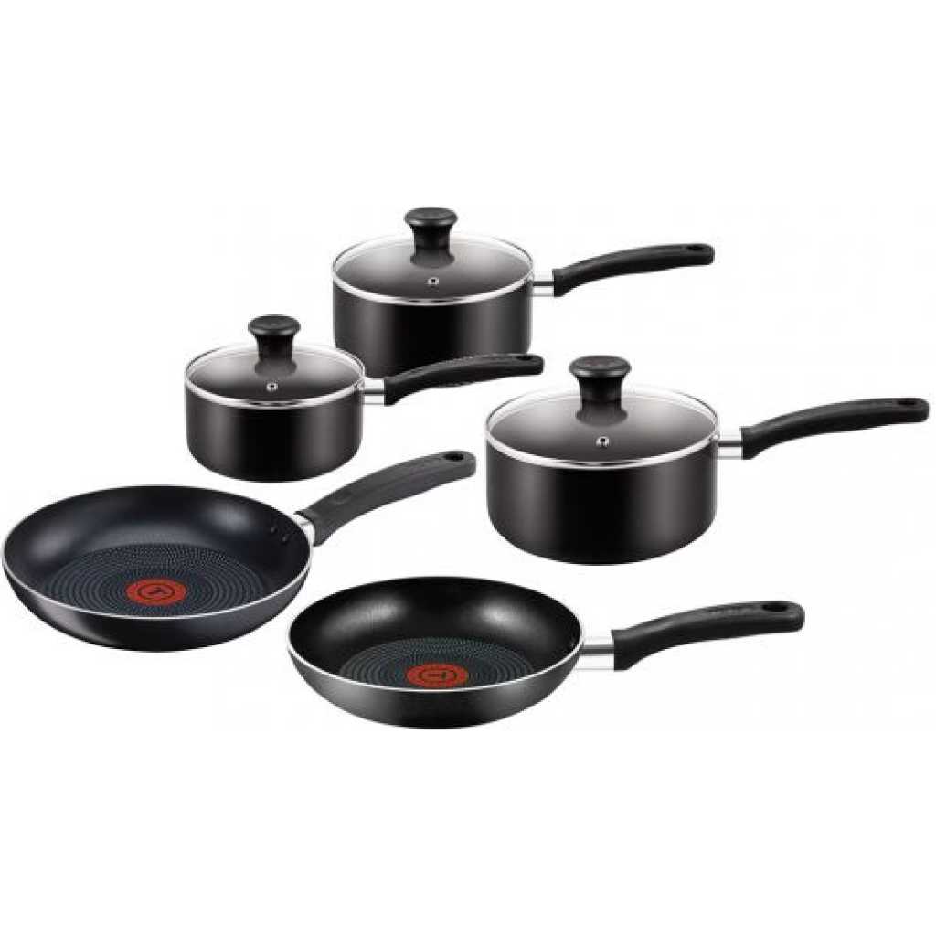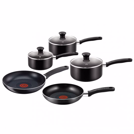 Meet Tefal Essential: An everyday cooking solution for the beginner chef designed to make cooking delicious meals effortless. The iconic Thermo-Spot® heat indicator changes to solid red to let you know when your pan has reached the ideal cooking temperature and it’s time to add your ingredients. No more under or overheating your food; Thermo-Spot® makes it easy to cook like a professional! Essential also features Tefal’s Powerglide non-stick coating. Extra-durable, this coating delivers longer non-stick performance. Even the exterior of the pans are non-stick which makes cleaning a breeze – easily wash by hand, or pop it in the dishwasher. Handles are designed to be ergonomic and comfortable in the handle for a secure grip. The pans are suitable for use with all hob types, except induction, and are ovenproof up to 175°C (Gas Mark 4, 350°F) for an hour – so you can start a meal on the hob and finish it off in the oven. Tefal Essential 5 Piece Set includes: 16cm, 18cm & 20cm Saucepans with lids, 20cm & 24cm Frying pans. Easy-to-use all hobs except induction range with advanced features for delicious everyday cooking results. Powerglide durable and easy to clean coating.Glass lid for perfect monitoring. Thermo-Spot® marking turns full red when the pan reaches the ideal temperature, for perfect searing performance made easy.