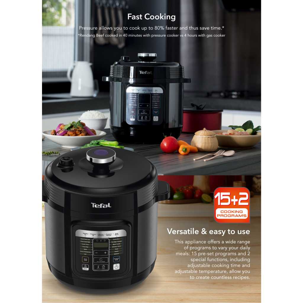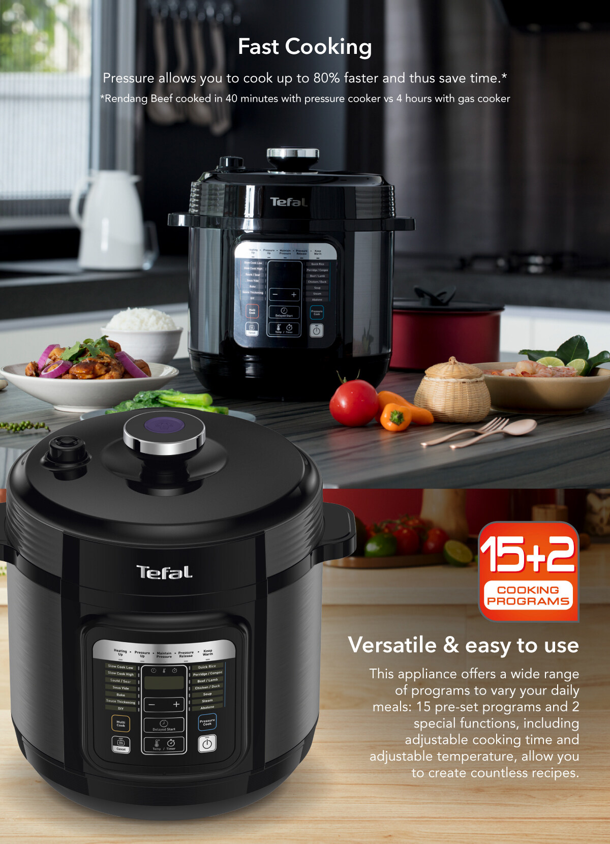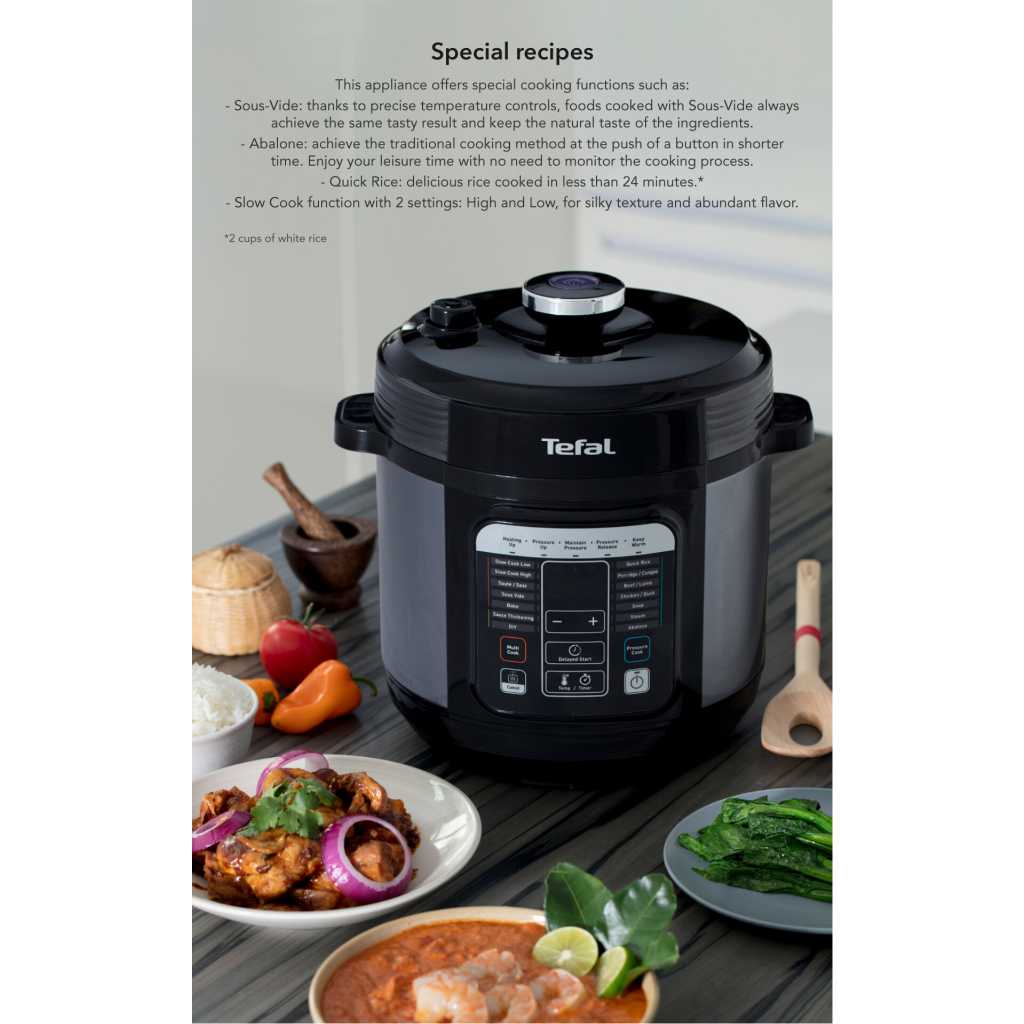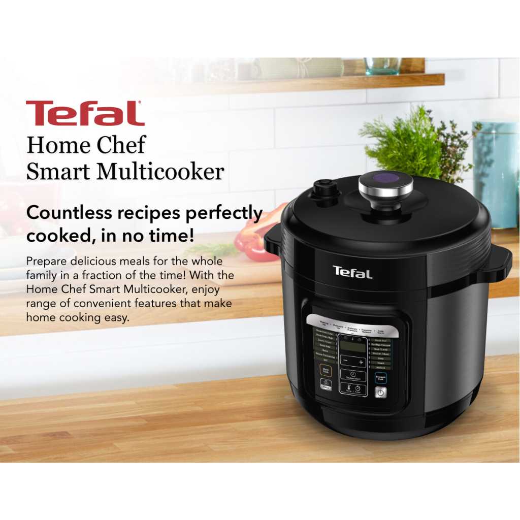 Tefal Home Chef Smart Multicooker 6 Liters Capacity 1000W power CY601D65, Black (01 Year Warranty) Countless recipes perfectly cooked, in no time! Prepare delicious meals for the whole family in a fraction of the time! With the Home Chef Smart Multicooker enjoy fast, versatile cooking on a wide array of recipes, thanks to 15 pre-set programs and 2 special functions. Its safe design, large capacity for the entire family and range of convenient features make home cooking easy. Home Chef Smart Multicooker: Perfectly cooked recipes, in no time! Spend less time in the kitchen and more time with the ones you love! Home Chef Smart Multicooker is the fast, versatile pressure cooker that will have you preparing delicious meals for the entire family in a fraction of the time. Featuring 15 pre-set programs, it does it all, from rice and congee to meats, soups and special recipes like sous-vide cooking and abalone. Two additional special functions allow you to adjust the cooking time and temperature, for still more creative possibilities. It even has a sauce thickening program for your soups and sauces! Offering optimum security thanks to 12 safety features, this convenient multicooker is equipped with automatic keep-warm and pre-set timer functions, both of up to 24 hours. Rounding it all off are a family-friendly capacity and an easy-to-clean design of removable parts and accessories, including a measuring cup, rice spatula, soup spoon and steam trivet. Essentials VERSATILE This appliance offers a wide range of programs to vary your daily meals: 15 pre-set programs and 2 special functions, including adjustable cooking time and adjustable temperature, allow you to create countless recipes. EASY TO USE 15 pre-set programs and 2 special functions at the push of a button SPECIAL RECIPES This appliance offers special cooking functions such as: – Sous-Vide: thanks to precise temperature controls, foods cooked with Sous-Vide always achieve the same tasty result and keep the natural taste of the ingredients. – Abalone: achieve the traditional cooking method at the push of a button in shorter time. Enjoy your leisure time with no need to monitor the cooking process. – Quick Rice: delicious rice cooked in less than 24 minutes.* – Slow Cook function with 2 settings: High and Low, for silky texture and abundant flavor. *2 cups of white rice SPECIAL COOKING FUNCTIONS This appliance offers special cooking functions, such as Sauce Thickening, which thickens soups and sauces after cooking for perfect texture. Fast cooking Product type Multi pressure cooker Max pressure level (kPa) 70kPa (Up to 3x faster than pot cooking) Pressure cooking Yes Capacity Numbers of serving Ideal for 4 people Bowl capacity 6 L Usable bowl capacity 4 L Full of recipe ideas Built-in recipes directly on device screen No Connected No Application No Number of built-in recipes – Multi function Automatic cooking programs 13 Delayed start Yes (Choose exactly when you want to eat) Manual mode Yes Cooking by ingredient (grains, vegetable, meat & seafood) No Keep warm Automatic Numbers of cooking program 13 Easy to use – Guidance Tilting screen No Reproportion by number of servings No Adjustable recipes by ingredients you have at left at home No Allow multi-layer cooking to cook a full meal at once No Control panel Full color LCD Safety device for overpression Yes with manual pressure release Step by step guidance In the recipe book Easy to use – bowl Inner bowl coating Non-stick PTFE coating PFOA free Yes, safety bowl coating Dishwasher safe Yes, accessories only Other features Technology USB Removable Cord Colours Black Visual cooking No