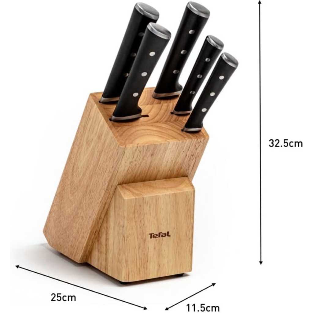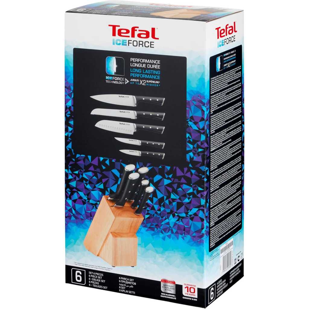 Key Features: TEFAL Ice Force Block + 5 Knives Ice Hardening, Stainless Steel Blade Kitchen Utensil, High Performance Cutting and Cutting Edge,10 Year Guarantee, K232S574 Colour Natural Brand Tefal Blade material Stainless Steel Blade edge Flat Grind Item dimensions L x W x H 21.5 x 13.9 x 40.5 centimetres Style Ice Force 5 Piece Kitchen Knife Block Is dishwasher safe No Handle material Stainless Steel, Wood Construction type Forged Manufacturer Groupe SEB