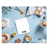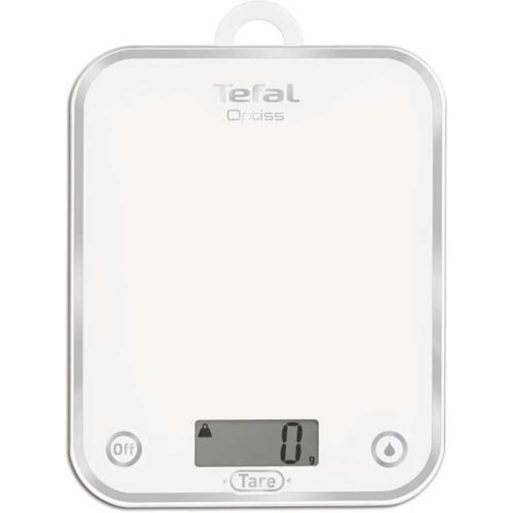 Tefal Kitchen Weighing Scale Optiss – BC5000V2, Max 5kg-White Tefal Optiss kitchen scale: BAKING MAKE EASY Convenient and efficient, Tefal Optiss is the perfect easy-to-use electronic kitchen scale. Save time and clean-up when baking or cooking: the TARE function ensures successive weighings in the same container. No need to transfer each ingredient, simply reset the scale to zero and continue adding ingredients. Also, no need for a measuring jug: with the liquid function switch easily between dry (g) or liquid weighings (cl/dl). No risk of error in converting units.Tefal Optiss boasts maximum capacity of 5 kg, and features a slim frame with striking aesthetics that fit seamlessly into any home. With batteries included for immediate use straight out of the box, Tefal Optiss combines great design and solid performance into one easy-to-use kitchen scale.Essentials MAXIMUM COMFORT OF USE The robust, scratch-resistant tempered glass platform is very easy to clean. Thanks to its large size, the platform is well-adapted to any container size. HIGH CAPACITY Perfectly adapted to all your recipes, from cookies to pancakes. GUARANTEED RESULTS Ideal for baking, where weighing to the gram is essential for success. SMART FEATURE Save time and clean-up when baking or cooking: the TARE function ensures successive weighings in the same container. No need to transfer each ingredient, simply reset the scale to zero and continue adding ingredients.