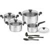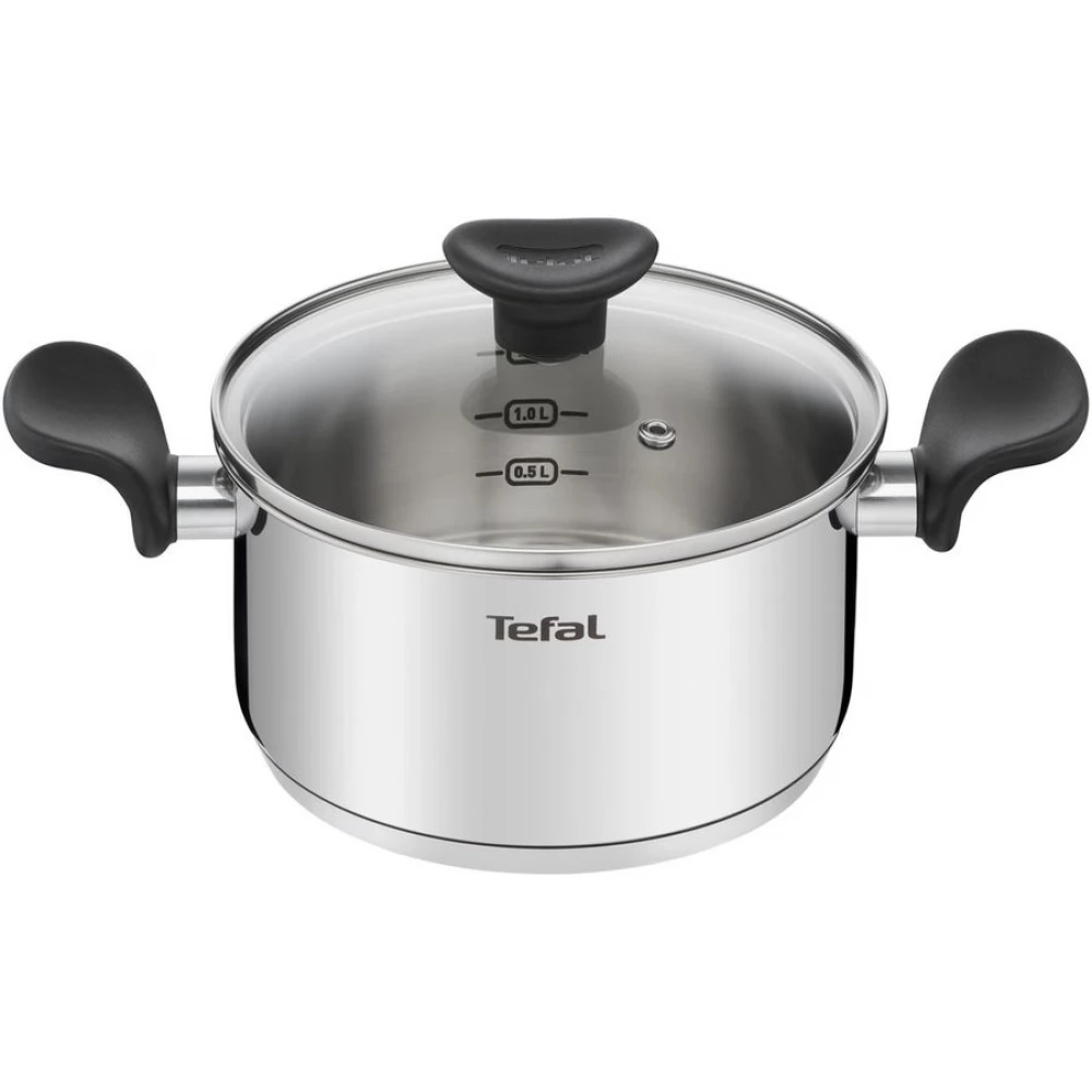 TEFAL Primary 11pc Cookware Set, Rust Free, Stainless Steel E308SB74, For All Heat Sources Including Induction. Type: set of dishes; Main items: 4; Min. size (cm): 16; Max. size (cm): 24; Min. volume (L): 1.5; Max. volume (L): 5.3; Material: steel; Lid material: glass; Handles: bakelite; Non-stick coating: is absent; induction compatible; dishwasher compatible; steam hole; layered bottom; measuring scale. Key Features: Induction Technology: The thick, encapsulated base ensures even heat distribution, so food doesn’t burn and cooks perfectly. Dishwasher Safe: Save time and energy thanks to easy cleaning. Measuring Scale: The built-in measuring scale makes measuring liquids easy. Glass Lid with Steam Vent: The lids prevent spills, and the steam vent regulates evaporation. Ergonomic Handles: The handles provide a comfortable grip and stay cool during cooking. Heat-resistant Accessories: The set includes the necessary cooking utensils, so you can start cooking right away.