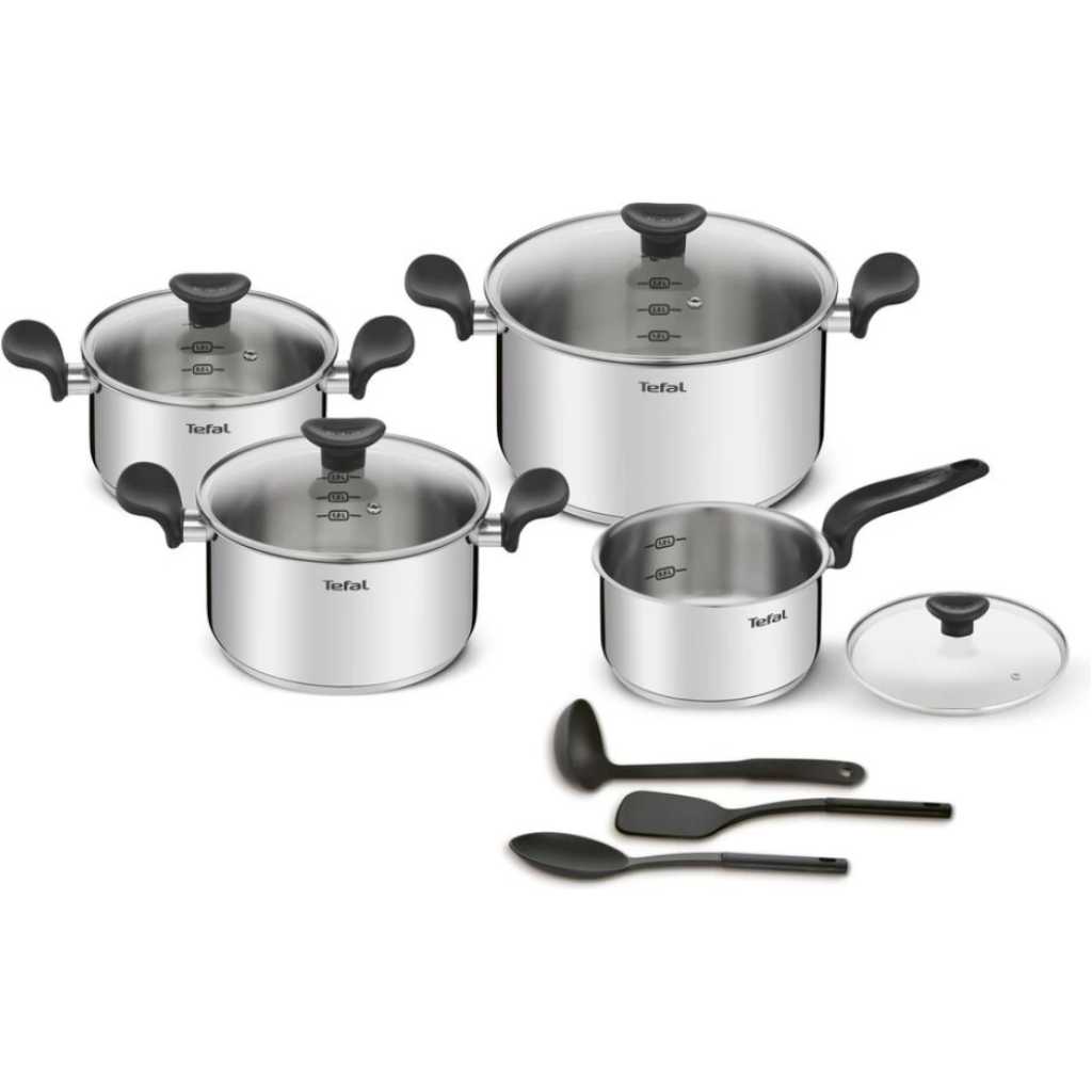Key Features: TEFAL Primary 11pc Cookware Set, Rust Free, Stainless Steel E308SB74. Premium quality stainless steel Fully inductive technology Easy-to-read gauges Glass lid with steam release – Ergonomic handle – Cooking accessories – Can be washed in a dishwasher Hob compatibility: All hobs + induction Capacity: 1.5, 2.2, 3.1, 5 l Diameter: 16, 18, 20, 24 cm