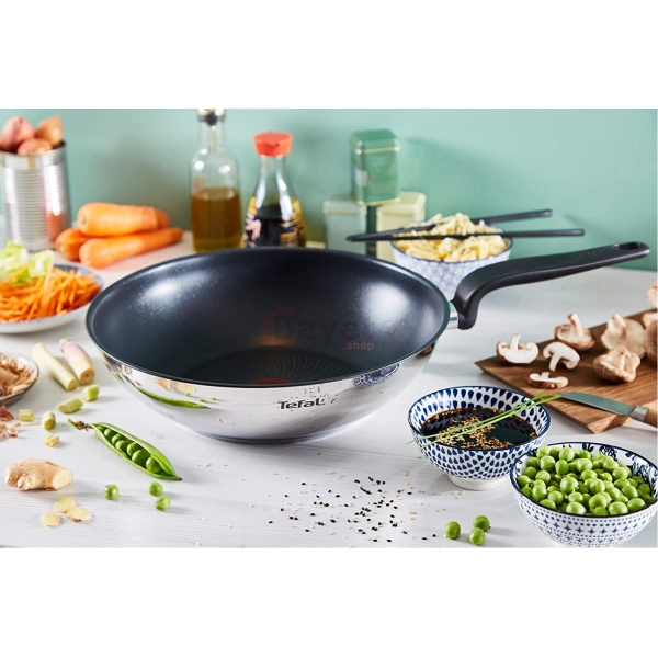 Tefal Primary 28CM Non-stick Wok Pan E3091904 – Stainless Steel (Gas, Electric & Induction). Stainless Steel With Non-stick Coating. Compatible with Smooth Surface Induction, Gas, and Electric Coil. Energy saving work pan thanks to the Thermo-Signal allows you not to waste energy. Thermo-Signal technology indicates the ideal cooking temperature to ensure perfect texture, colour, and taste. the induction base ensures even heat distribution for delicious cooking results. perfect stability and a Bakelite handle that stays cool even during cooking. long-lasting performance and reliability. Dishwasher safe. Model Number : E3091904