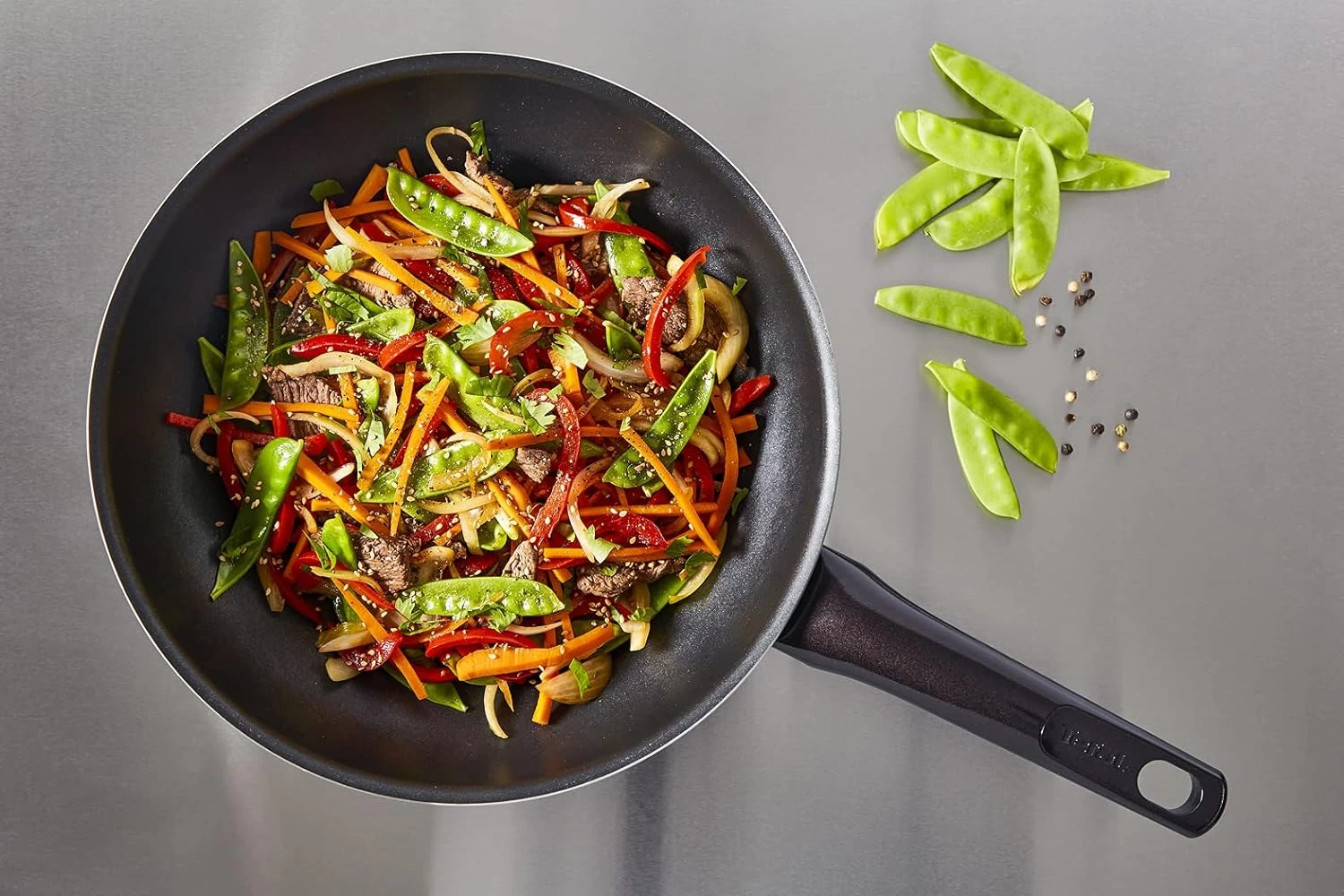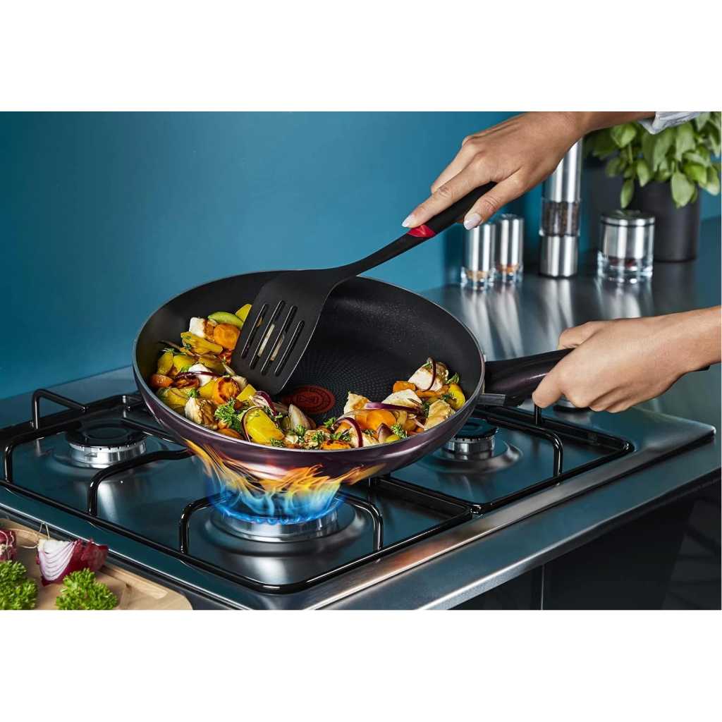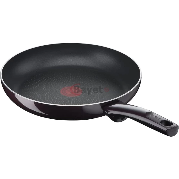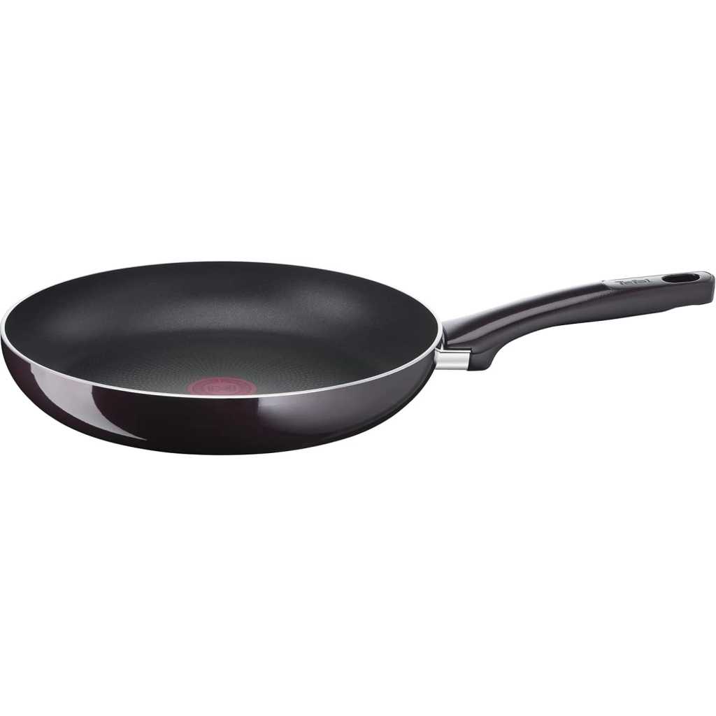 TEFAL Resist Intense 32 cm Non-Stick Aluminium Frypan With Thermo Spot D5220883 – Burgundy. The new Thermo-Spot starts cooking at the ideal temperature for easy and delicious results The new Powerglide coating, for longer extra glide: easy to use and easy to clean The ergonomic handle: easy to handle Open shape and pouring spout to serve food easily Lightweight for easy and convenient use Non-stick exterior coating: easy to clean Dishwasher safe. FLAME PROTECT: For maximum resistance to dynamic cooking on gas stoves Compatible with all heat sources except induction.