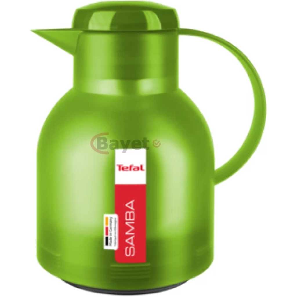 Key Features: Tefal Samba Jug, Vacuum Flask, 1- Liter, Glass Liner K3036312 – Translucent Green. Simple and colorful design 100 % airtight Optimum thermal storage One hand fastening thanks to the Quick Press Heavy Duty 5-Layer Blown Glass Bulb. Leak Proof Air Tight Keeps hot for up to 12 hours keeps cold for up to 24 hours Glass Linear Vacuum Insulation