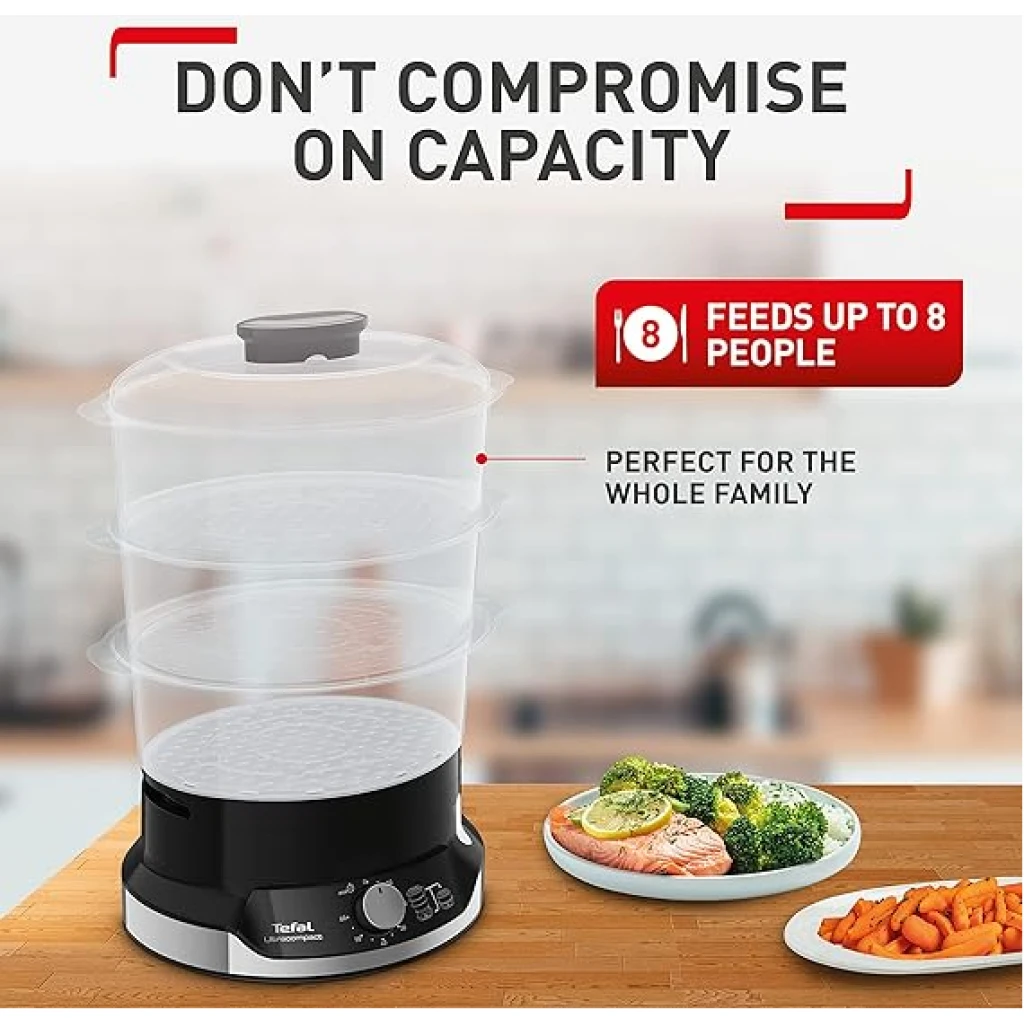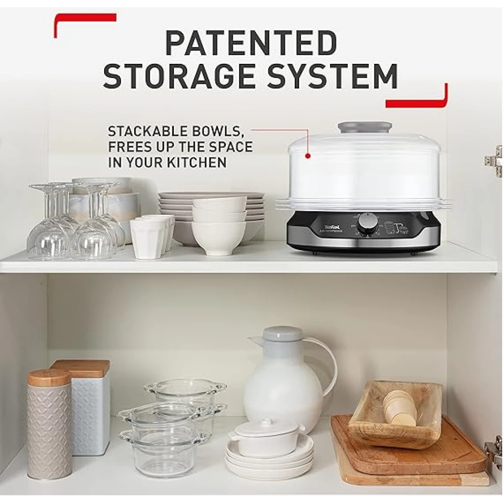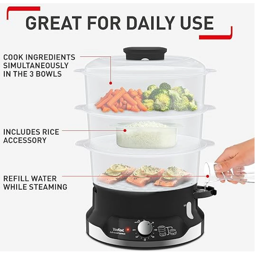 Key Features: Healthy Cooking: Low-fat steam cooking maintains maximum vitamins and nutritional value ; BPA-free bowls for total peace of mind Easy to use: Smart features like a 60-minute timer, an indicator light during heating, 6 spots in each bowl to cook eggs, an easily viewable water level and unlimited autonomy with the ability to refill water while steaming is in progress Easy to store: A convenient steam cooker with a patented ultra-compact storage system with stackable bowls (including rice bowl) on the base Perfect capacity: The large 9 L capacity 3-bowl multi-tier system uses three steaming bowls at once, saving time while offering enough for special occasions and everyday use Generous rice bowl: A large 1 L rice bowl, ensuring enough rice for the whole family