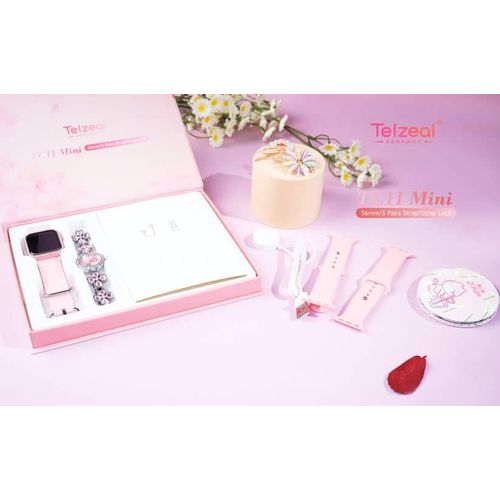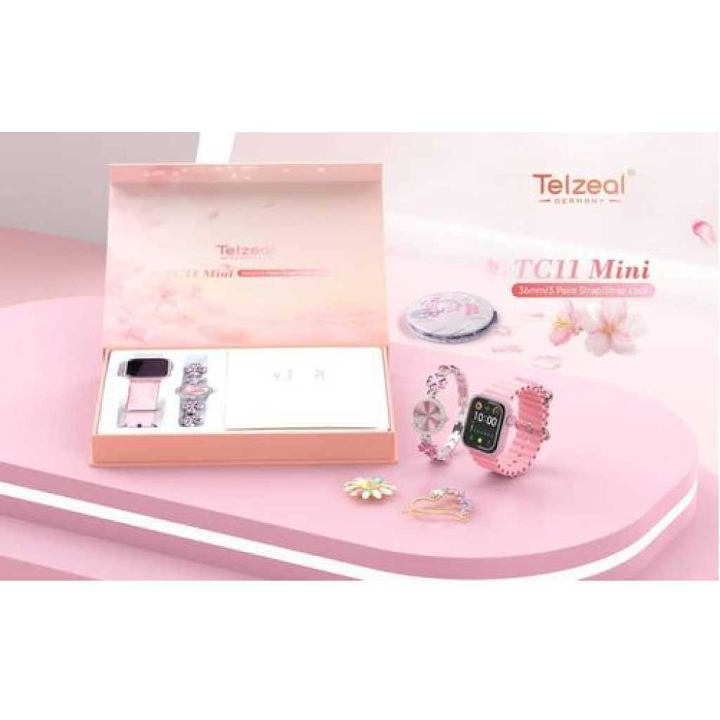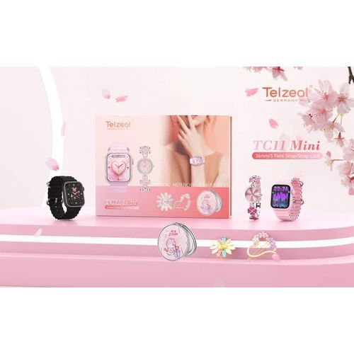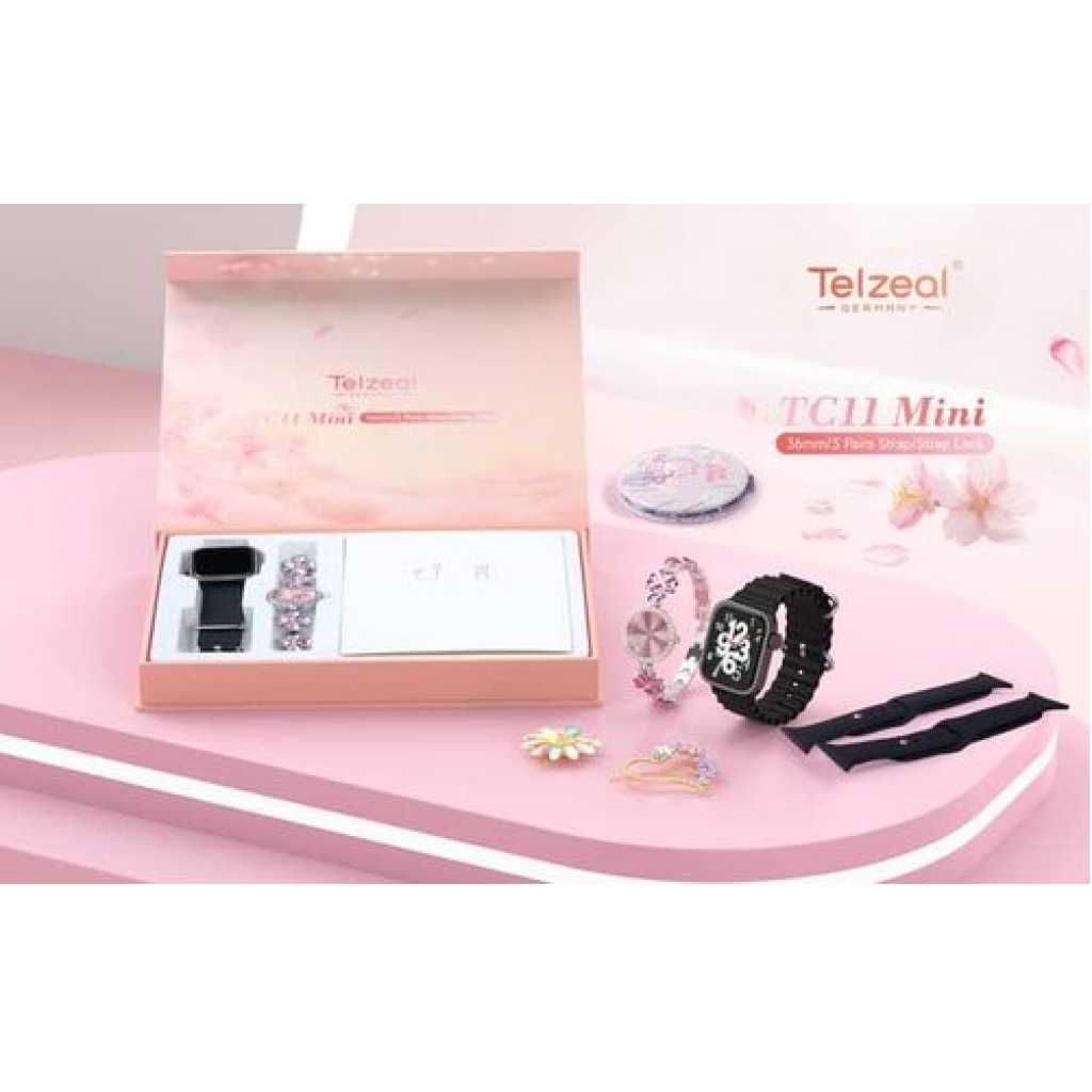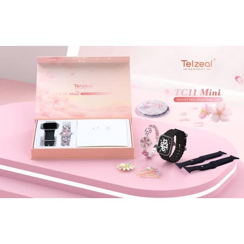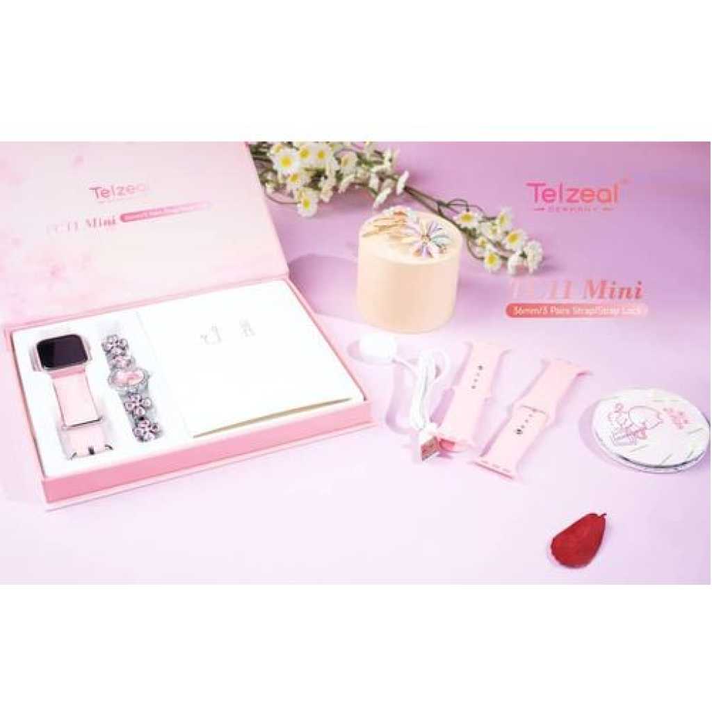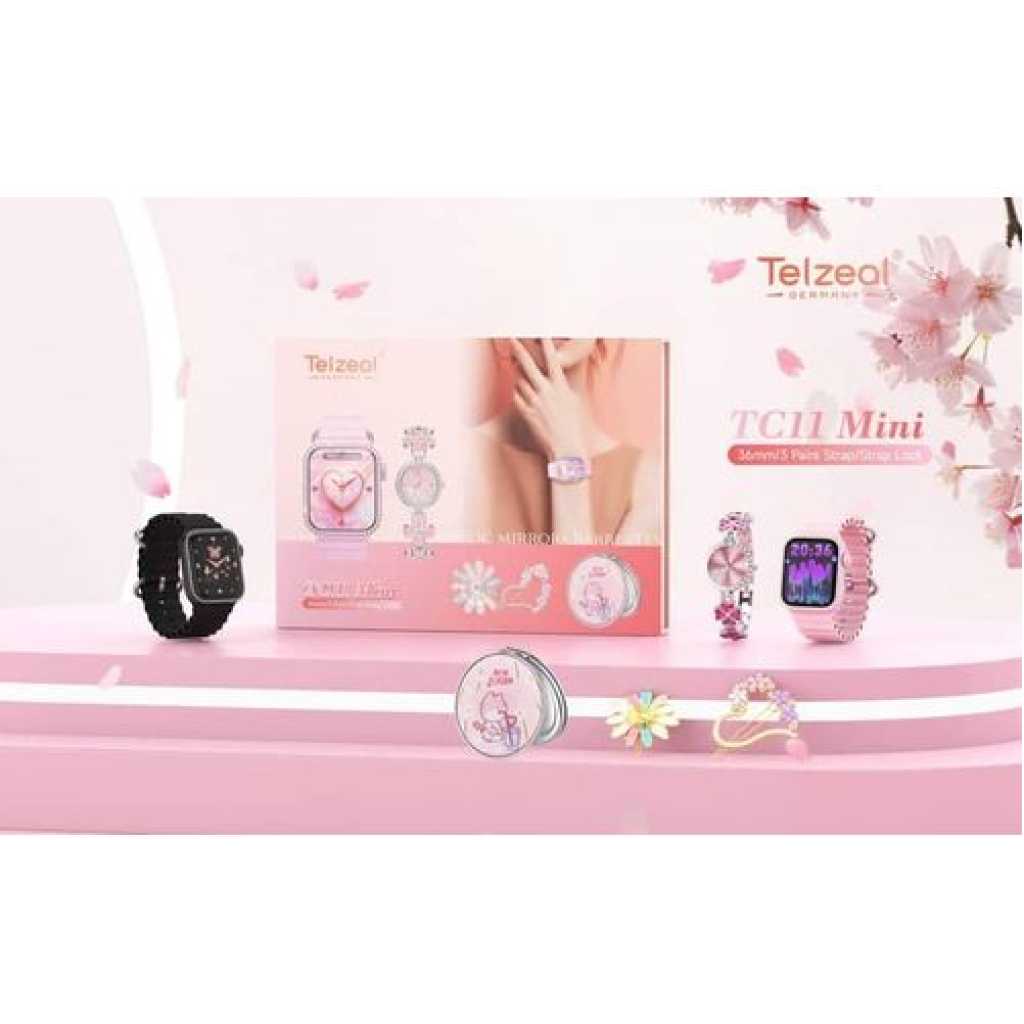 Telzeal TC11 Mini Smart Watch With 3 Pair Strap Analog Watch Makeup Mirror Hair Clip and Wireless Charger Combo For LadiesCompatible with Android and iOS Devices