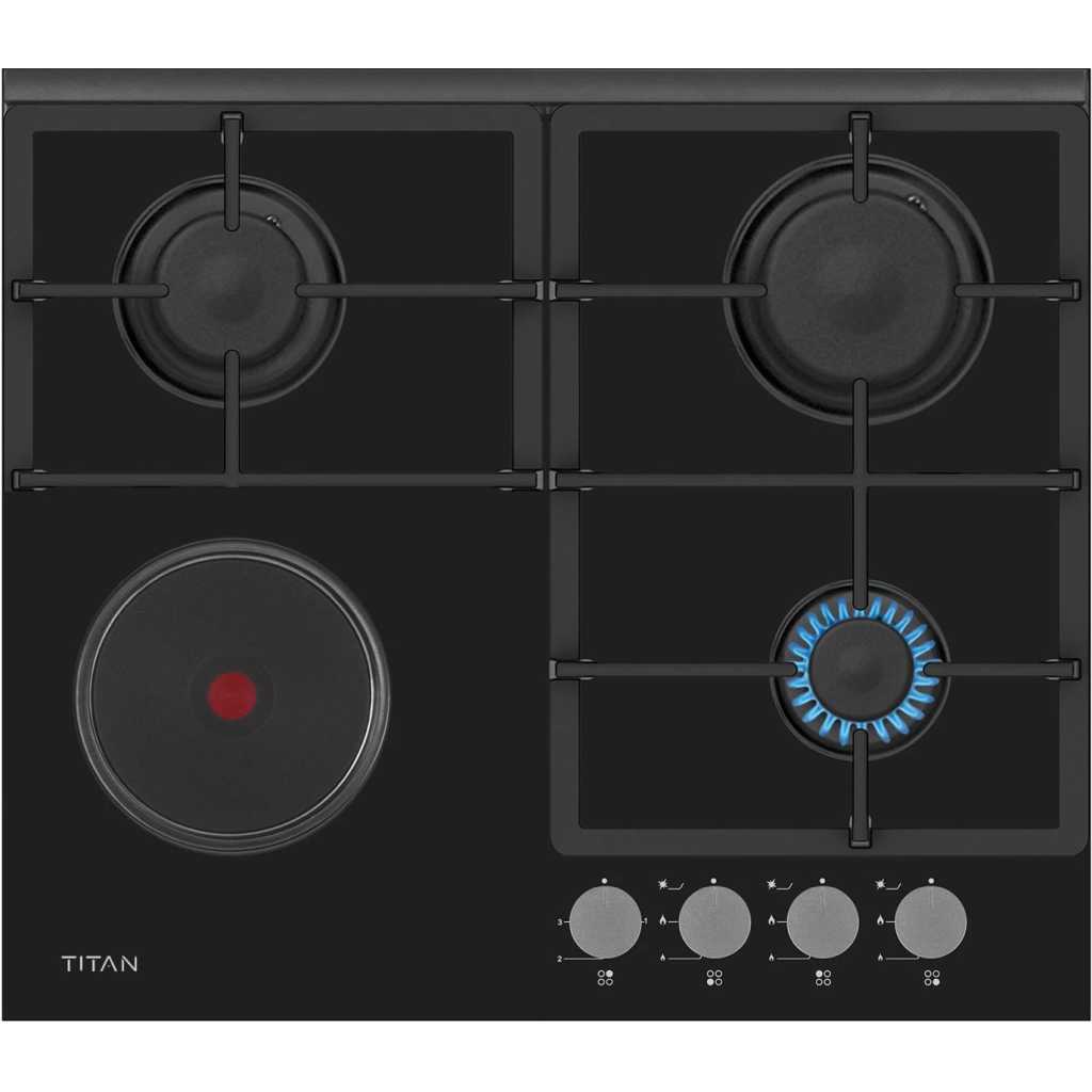 Key Features: Titan 60cm Built-In Hob 3 Gas + 1 Electric Plate, TN-BIH6310BA. 3 gas burners + 1 Electric Plate Front control panel Flame failure safety device Cast iron grid Auto ignition Black 1-Year Manufacturer Warranty