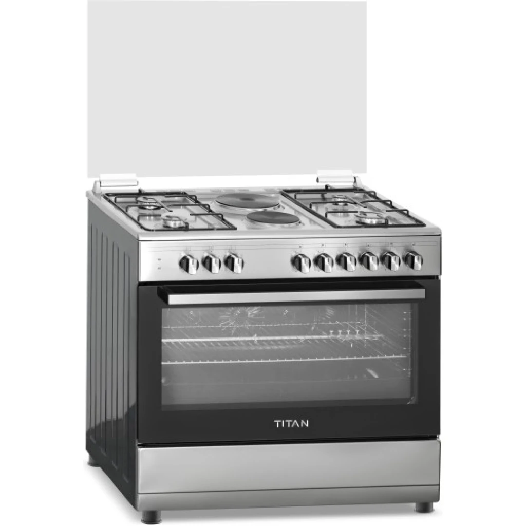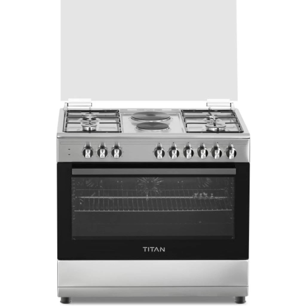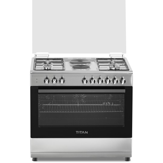 90cm wide cooker. H: 85cm, D: 60cm. 4 Gas burners with automatic electric ignition 2 Electric Hot plates Electric Oven Electric Grill & Rotiserrie Oven Fan Oven Lamp Timer Enamelled Pan Support 1-year warranty Titan TN-FC9420XBS 4 Gas + 2 Electric Plates Freestanding Cooker; For preparing delicious and aromatic home-cooked meals with this high-quality Cooker from Star Track . Made of Stainless Steel in a nice brushed finish that comes in with glass panels for a sleek and timeless This high-performance freestanding Gas Range features 4 Full-Safety Glass Top Lid, Push Button Ignition for HOBS & OVEN, that allow you to prepare multiple dishes at the same time. Can run on LPG and NG using a converter kit. Suitable for single or family-households, this semi-professional oven comes with a wired shelf, oven tray and Rotisserie to prepare delicious chicken and meat. High-Quality Design & Functionality semi-pro gas-cooker has been designed to meet high standards in the kitchen – also at home! 3 Full-Safety-Burners with Automatic Ignition, Push Button Knobs and Large Oven Cavities Glass Top Lid, Push Button Ignition for HOBS & OVEN Cast Iron Pan Support & Matt Enamel Burner Caps Double Glass Oven Door, Lamp, Rotisserrie, Turbo Fan Thermostat, 1 Oven Tray, 1 Oven Grid, Adjustable Feet. Hobs + Panel STAINLESS STEEL AUTOMATIC SAFETY GAS CUT-OFF FOR COMPLETE PEACE OF MIND This thermic flame safety device cuts off the gas supply when the burner fails to ignite or goes out. SecurGas devices are also integrated in the oven and grill burners with full safety. FAMILY SAFETY FIRST Our cast iron trivets flat design ensure the base of your pots and pans are fully supported, allowing you to have a safe and stable cooking environment. DETERGENT FREE SELF-CLEANING OVEN Catalytic enamel absorbs air when the oven is cold, and the catalyst in the enamel burns off soil when the oven heats up, meaning no detergents are required to clean the surface. PERFECT ROTISSERIE COOKING The specially designed automatic turnspit mechanisms ensure your meats and vegetables are browned and cooked to perfection, yet succulent and juicy inside.
