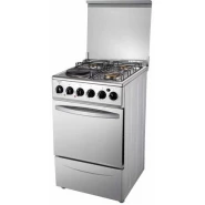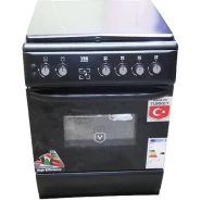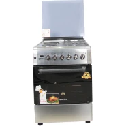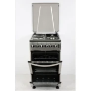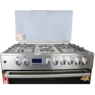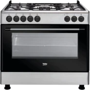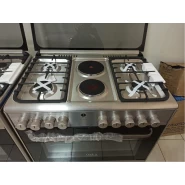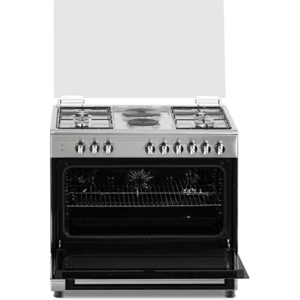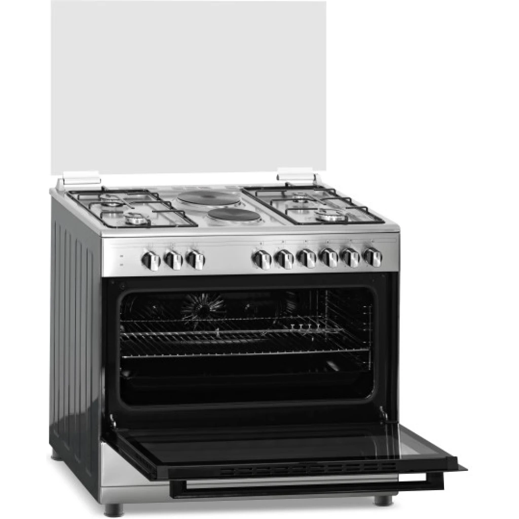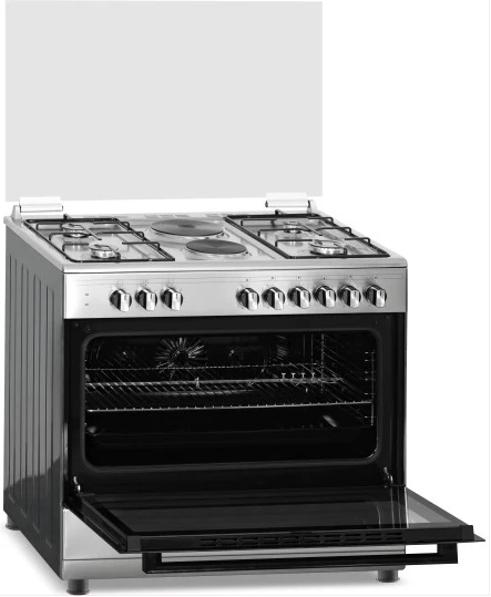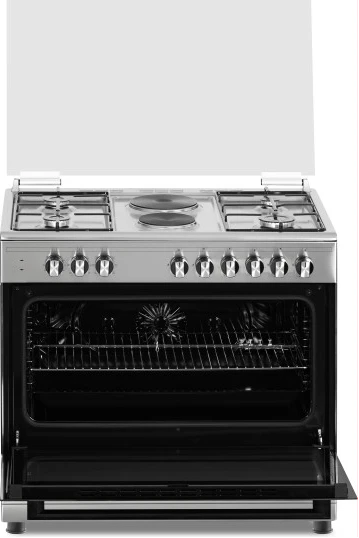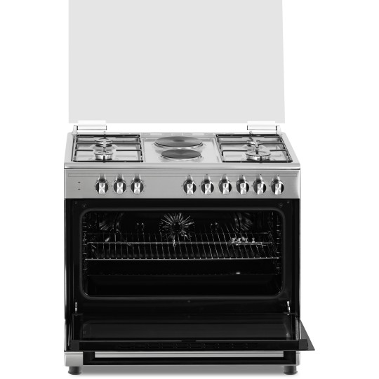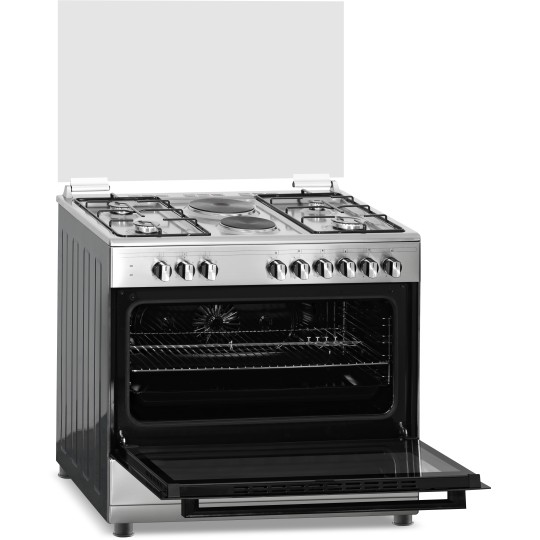 Key Features: 90cm wide cooker. H: 85cm, D: 60cm. 4 Gas burners with automatic electric ignition 2 Electric Hot plates Electric Oven Electric Grill & Rotiserrie Oven Fan Oven Lamp Timer Enamelled Pan Support 1-year warranty
